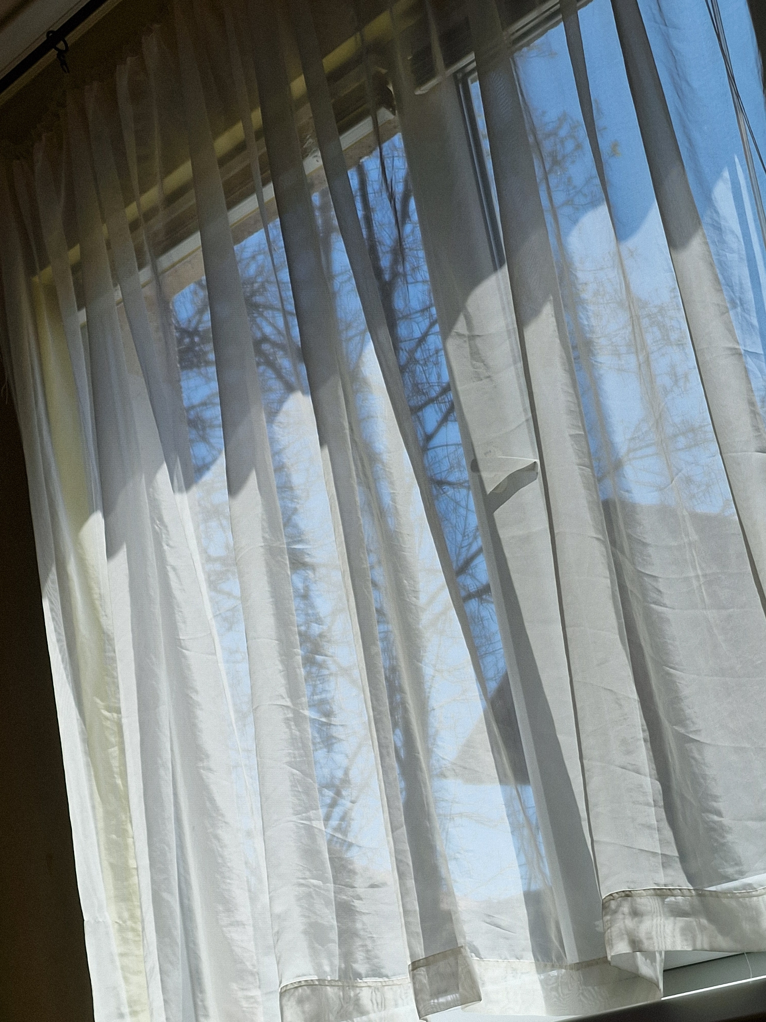 The image displays a close-up view of white, translucent window blinds or shades, likely Roman blinds, drawn across a window. Bright sunlight filters through the sheer fabric and illuminates the scene…read more