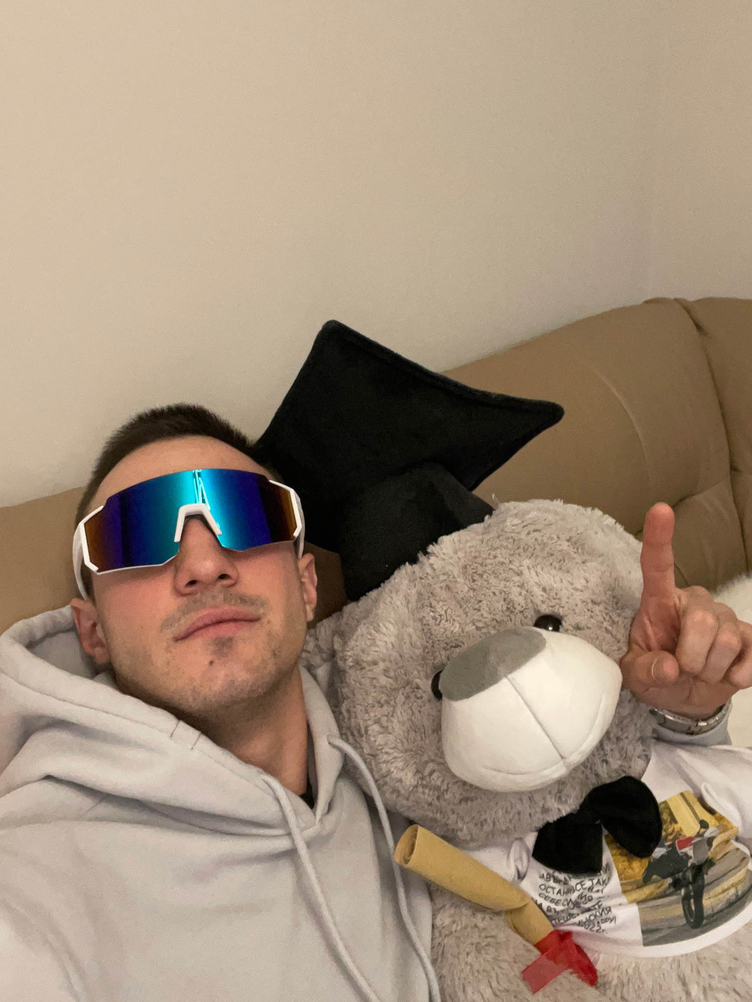 The image shows a man with dark hair wearing mirrored sunglasses and a light grey hoodie. He is lying on a couch with a grey teddy bear. The teddy bear is wearing a white t-shirt, a black bow, and has…read more