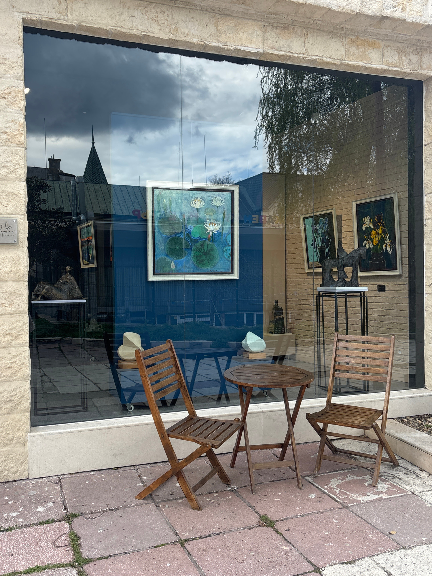 The image depicts a storefront window in Varna, Bulgaria. The reflection in the window shows a cloudy sky, a building with a spire, and trees. The interior of the store, visible through the window, di…read more