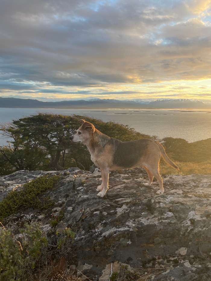 A brown and gray dog stands on a rocky outcrop, overlooking a scene of water and distant mountains under a cloudy sky. The dog is positioned near a small green tree or bush, which grows from the rock.…read more