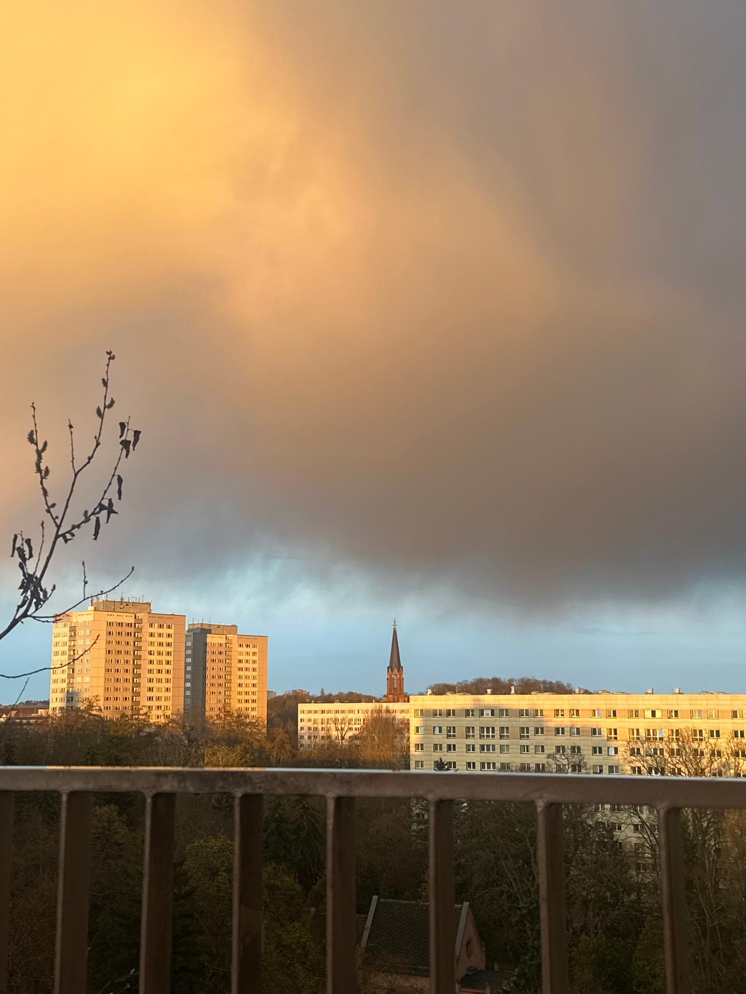 The image presents a view from a balcony overlooking a cityscape, likely in Berlin, Germany. Tall apartment buildings dominate the midground, illuminated by a warm, golden light, possibly from a settiβ¦read more
