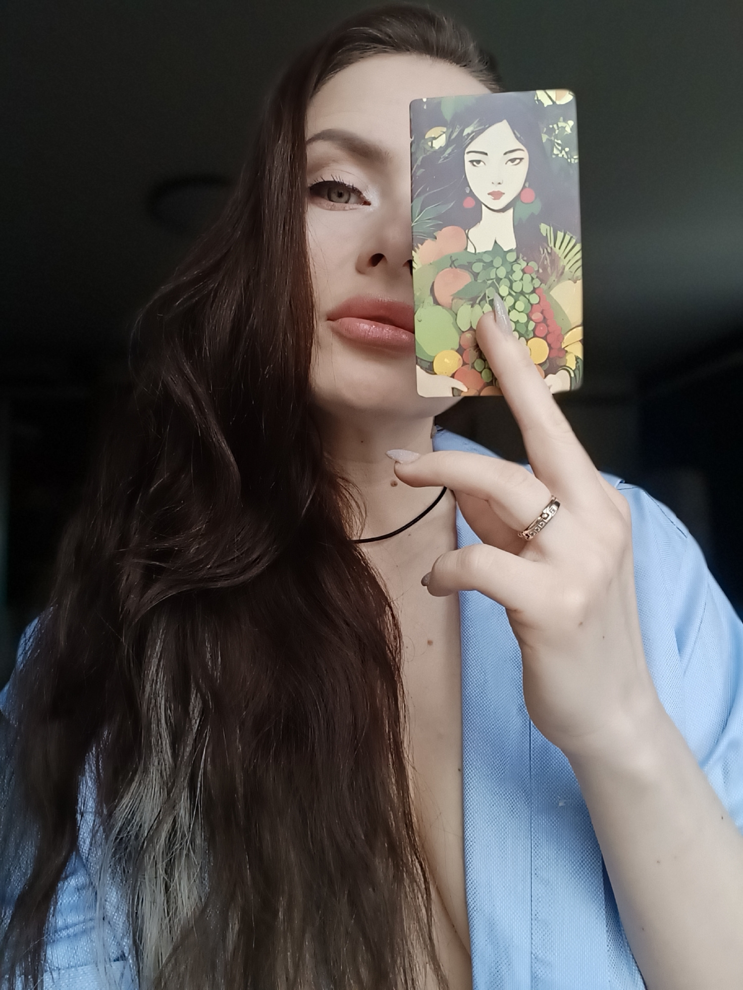A woman with long, dark, wavy hair is captured in a close-up, holding a rectangular illustrated card to her face. The card obscures the left side of her face, with her right eye and the lower part of…read more