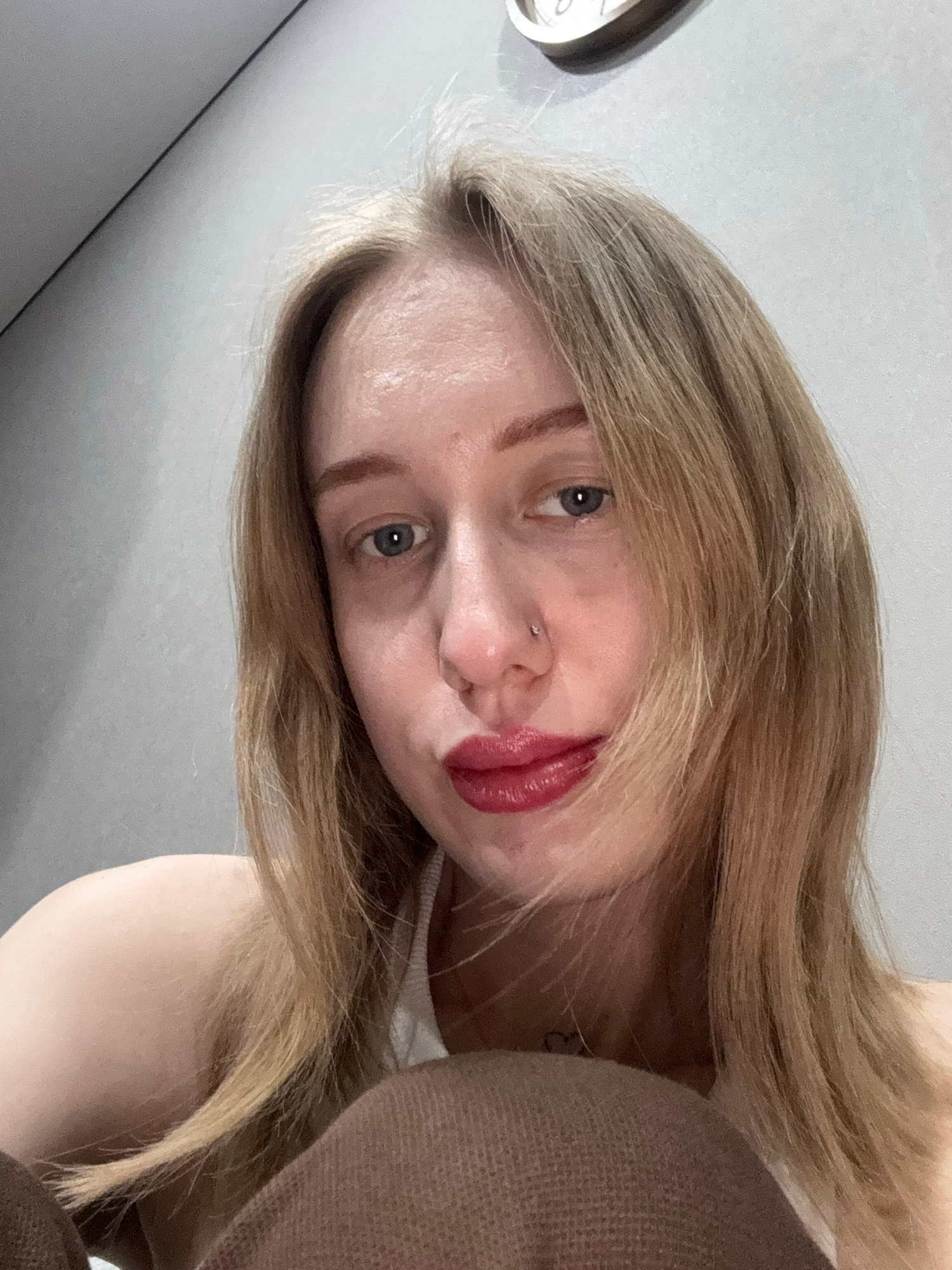 An indoor portrait captures a female subject looking directly at the camera. The background consists of a plain light gray wall, with a partial view of a wall-mounted clock featuring a silver rim in t…read more