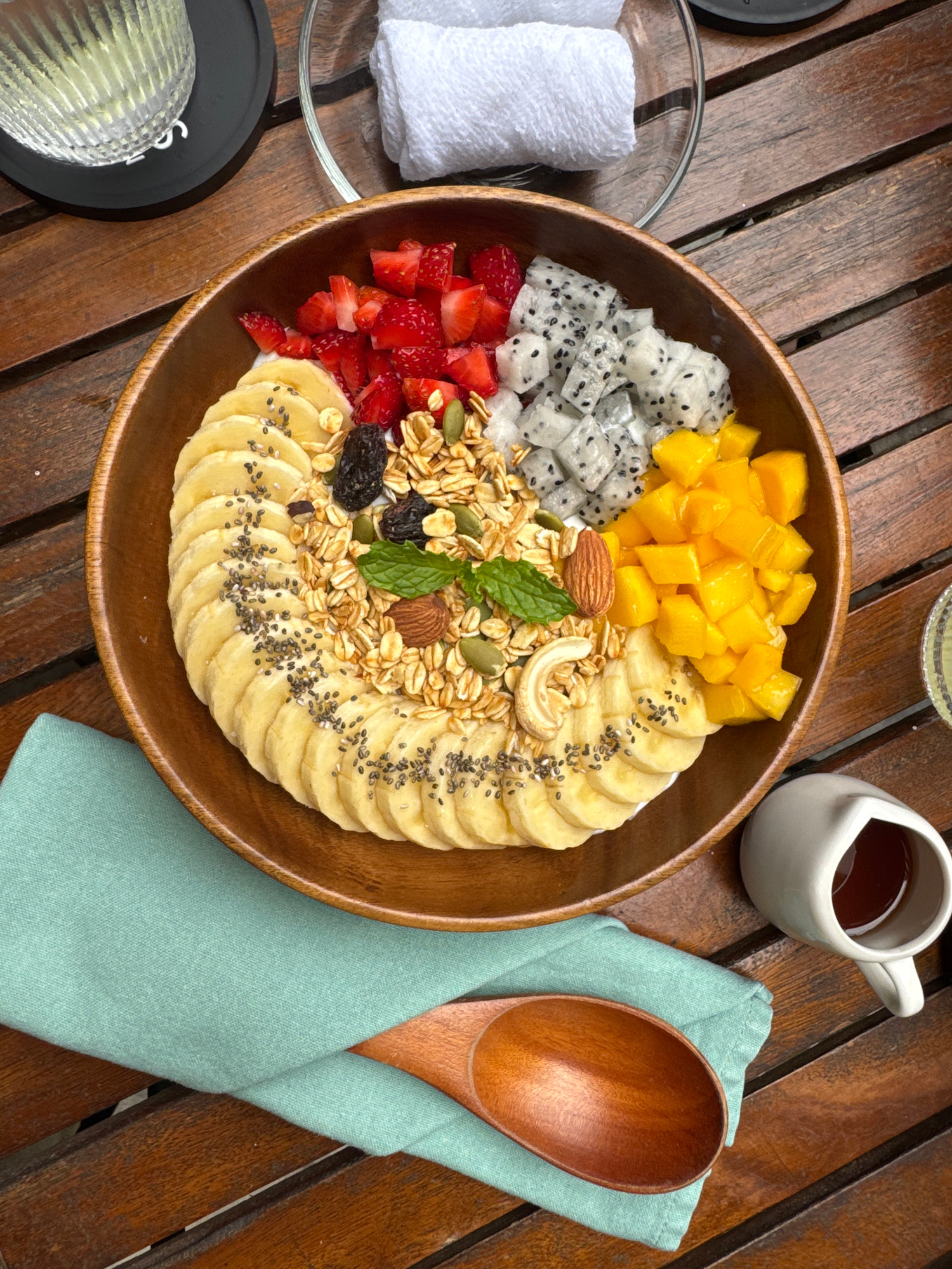 The image displays a beautifully arranged breakfast or brunch bowl set on a warm, slatted wooden table, indicative of a natural and inviting dining environment, possibly in Đà Nẵng, Vietnam. The cent…read more