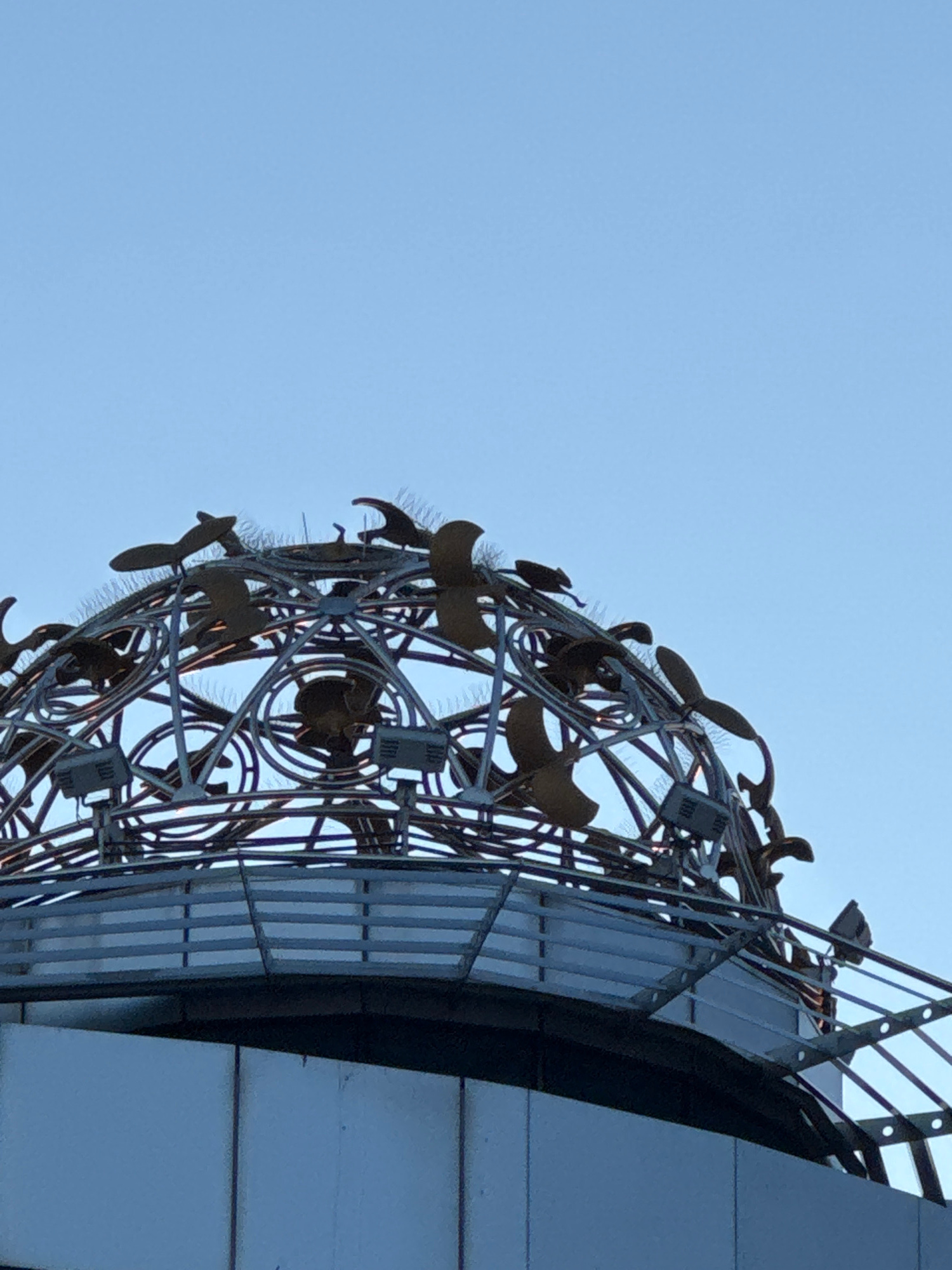 The image shows the sculptural installation "Compass of Rose", located in Burgas, Bulgaria. The sculpture features metal birds and circles arranged within a spherical, lattice-like metal frame. This s…read more