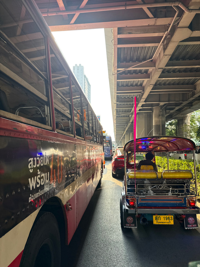 The image depicts a ground-level urban street scene in Bangkok, Thailand, characterized by stationary or slow-moving traffic under a large elevated rail structure. A large, older-model public bus, pre…read more