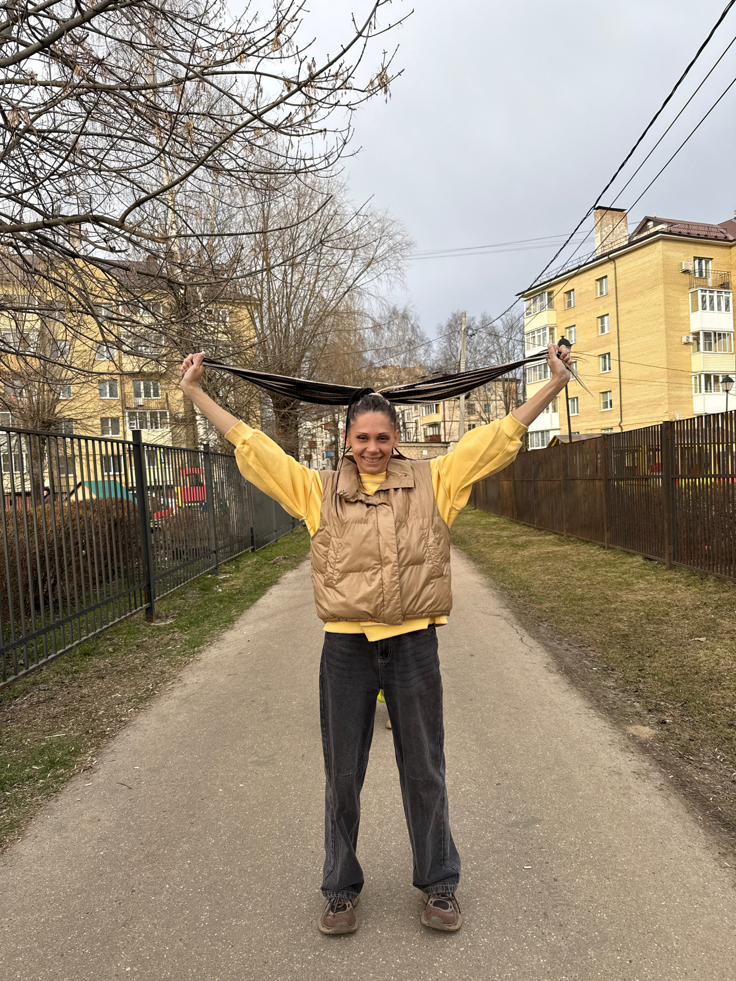 A woman stands smiling on a narrow paved path in Rusanovo, Russia, holding her long braids outstretched above her head. She wears a yellow long-sleeved shirt, a tan quilted vest, dark jeans, and brownβ¦read more