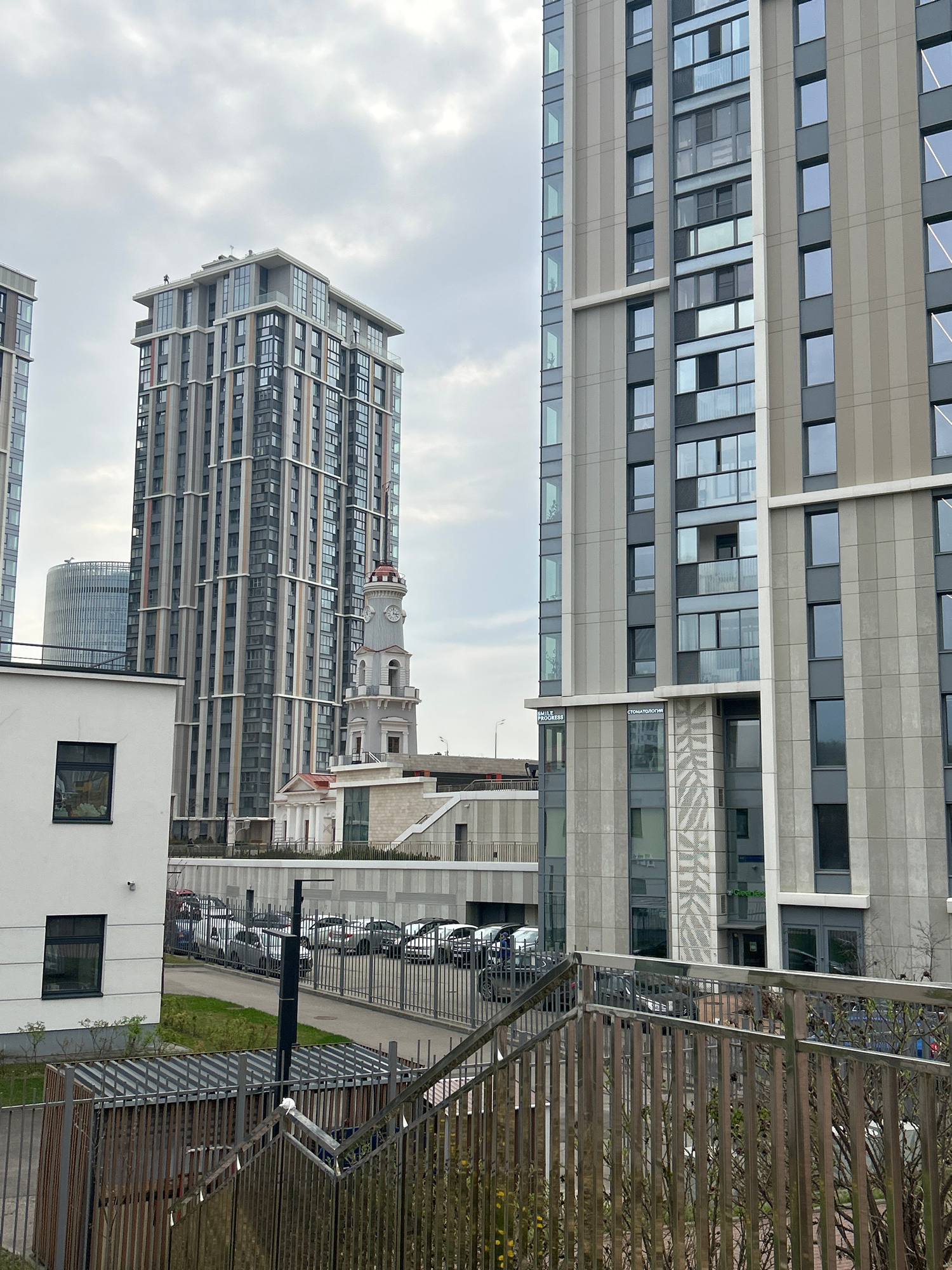 This media file captures an urban street scene in Moscow, Russia, characterized by a mix of modern and older architecture under an overcast sky. The scene is dominated by tall, contemporary buildings…read more