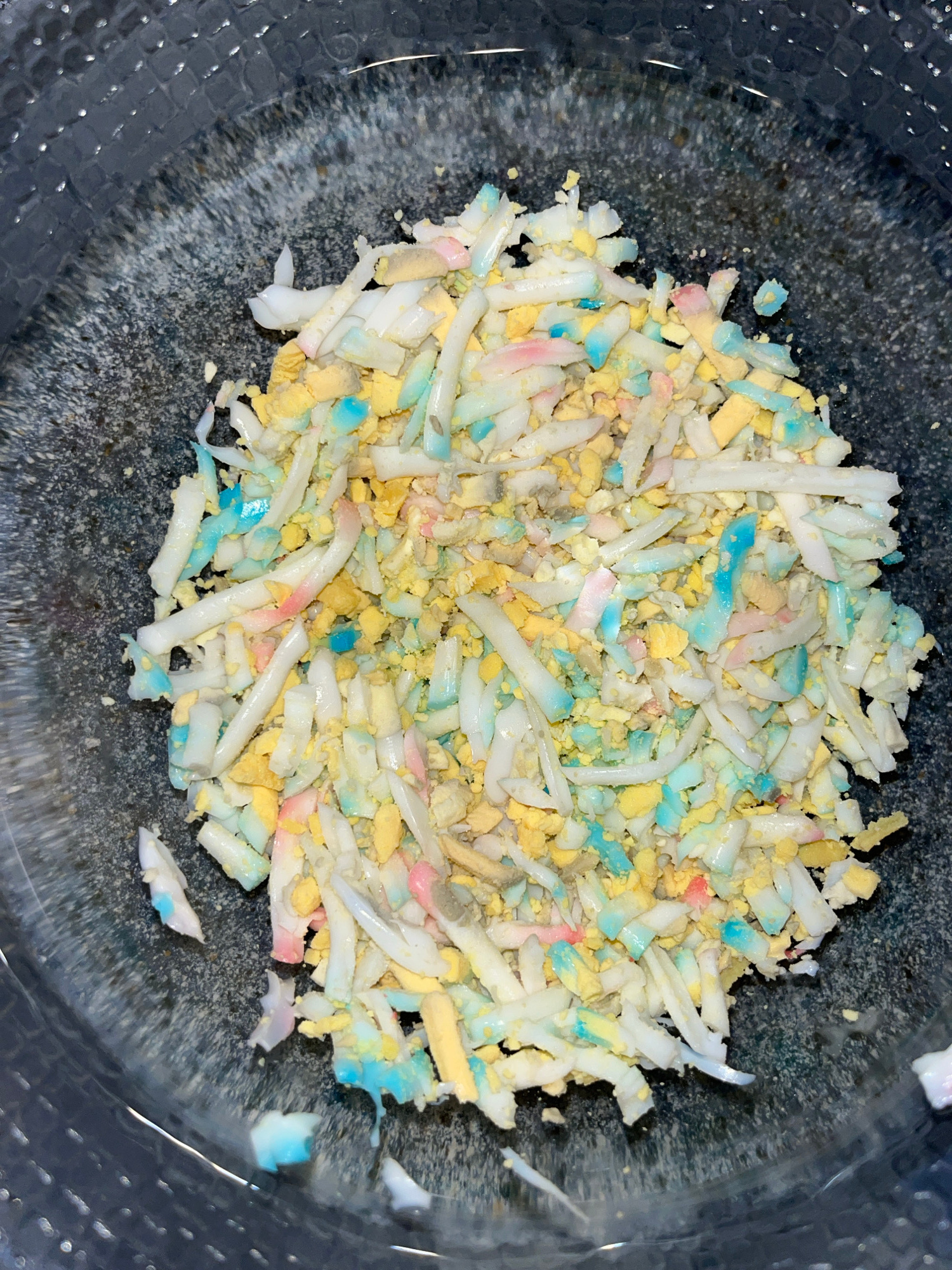 The image shows a pile of finely chopped, multi-colored material inside a dark, textured bowl. The chopped material appears to be composed of white, yellow, blue, and pink segments. There is no indica…read more