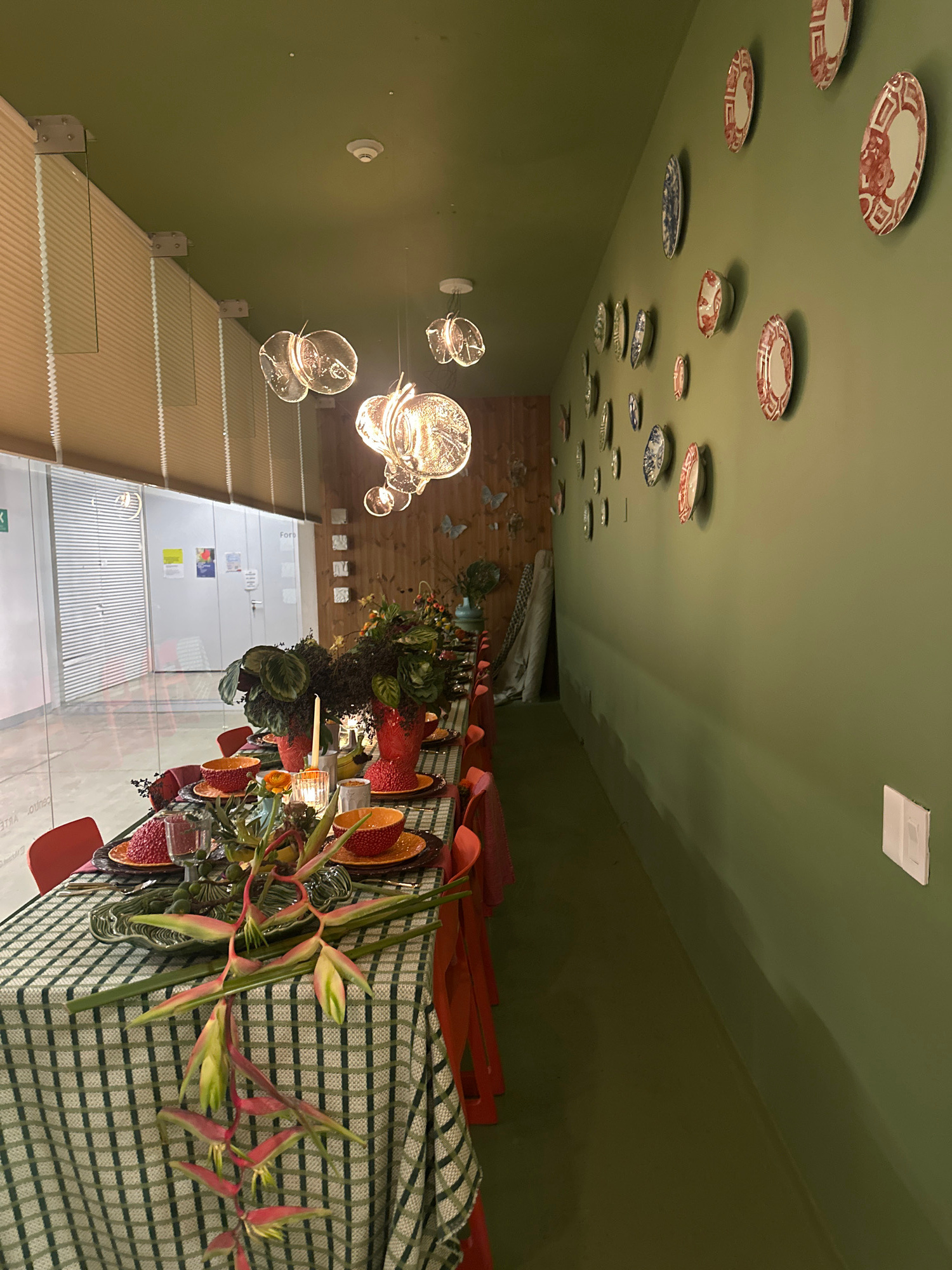 The image captures an elaborately decorated indoor space, possibly a restaurant or event venue, set for a gathering. The dominant color scheme features shades of green and red. The ceiling, painted a…read more