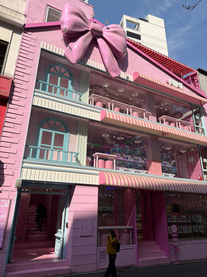 The image depicts a multi-story commercial building with a highly stylized, predominantly pink facade located in the Myeongdong district of Seoul, South Korea, identified as NINI's House. A large, glo…read more