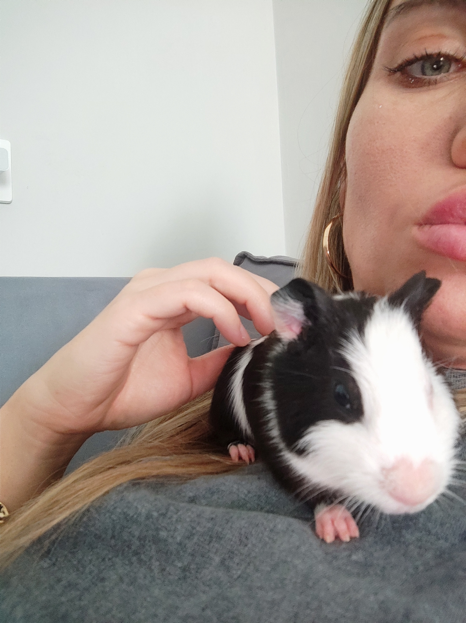 The scene is an indoor, close-up view from Votkinsk, Russia, depicting a female subject interacting with a guinea pig. The upper right quadrant of the image shows the right side of a female's face, fe…read more