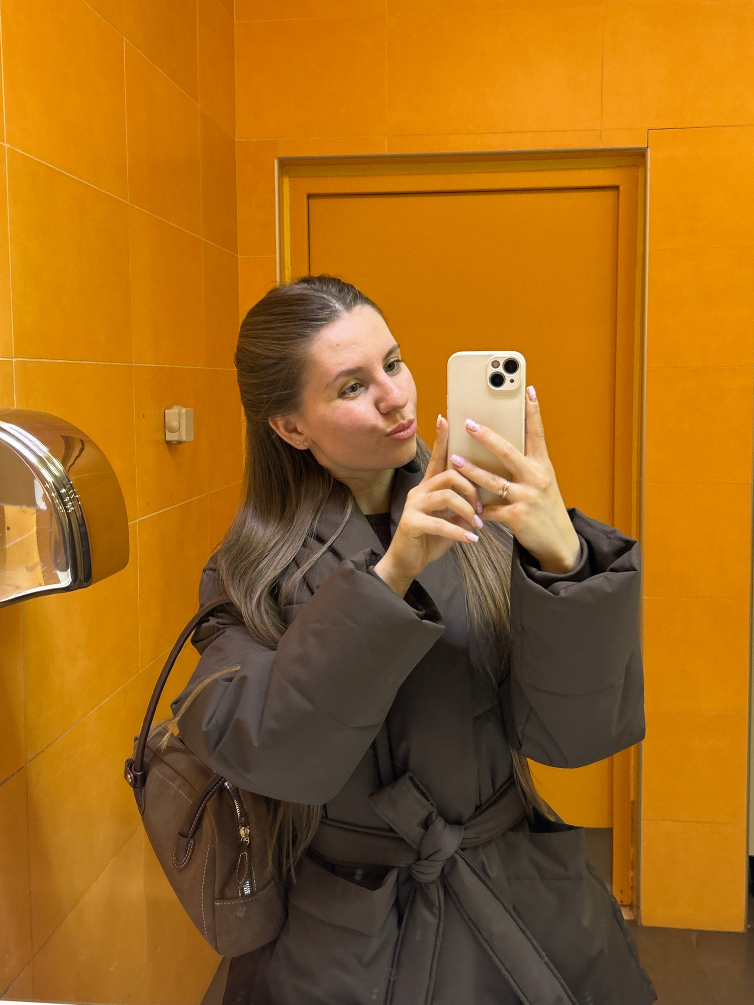 A woman is taking a selfie in a public restroom. She is wearing a brown, belted puffer coat and holding a white smartphone in her hands. The restroom has orange-tiled walls and floor. A hand dryer is…read more