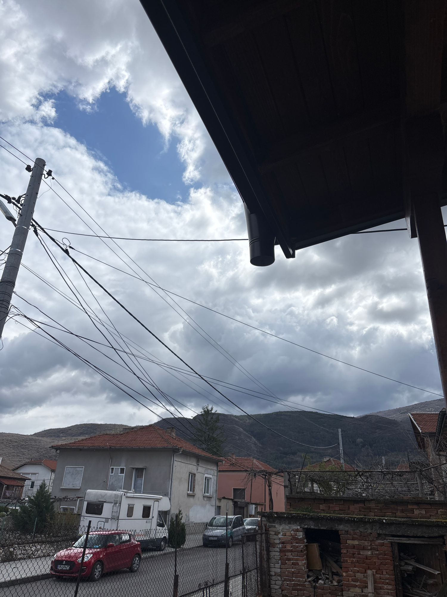 The scene depicts a residential area in Kuklen, Bulgaria, viewed from a low angle, possibly from under an overhang or porch. The sky is mostly cloudy with some patches of blue. Overhead power lines cr…read more