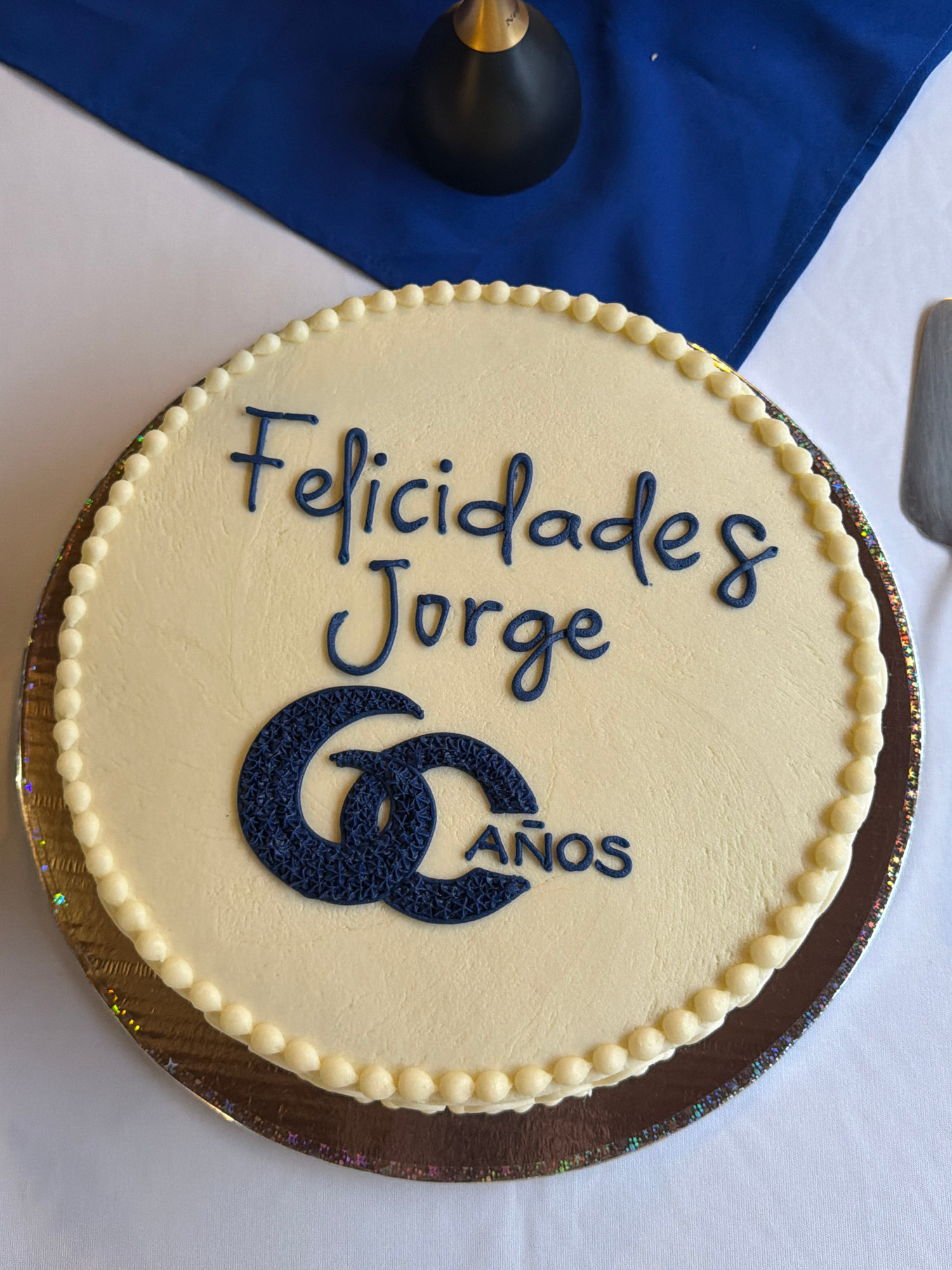 The image shows a round cake with white frosting, decorated with dark blue lettering that reads "Felicidades Jorge 60 Años." The cake is on a gold-colored cardboard cake board. To the left of the cake…read more