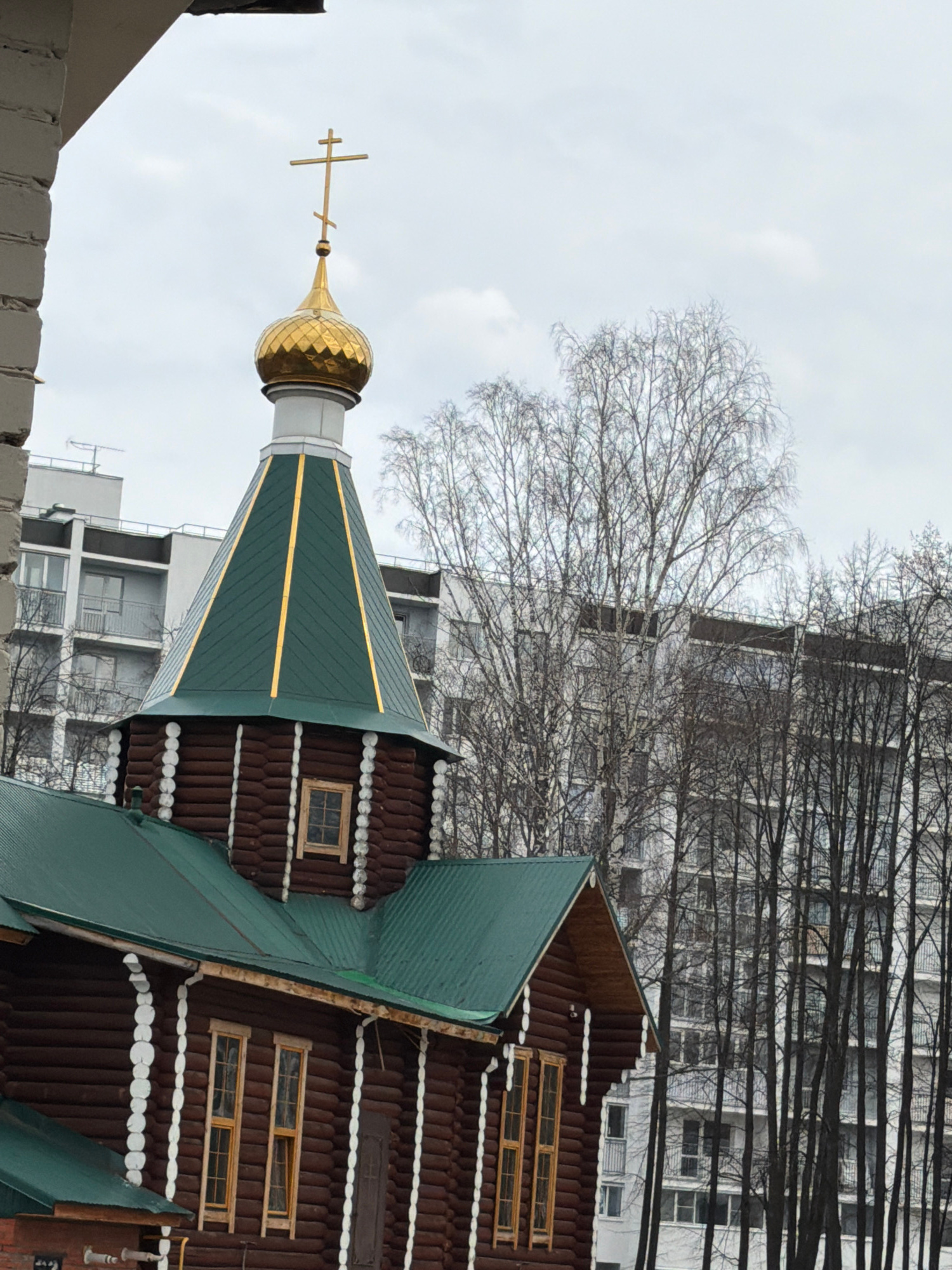 The image shows a church in the city of Chaikovsky, Russia. The church has a golden dome and a green roof. The walls of the church are made of brown logs with white trim. There are windows visible onβ¦read more
