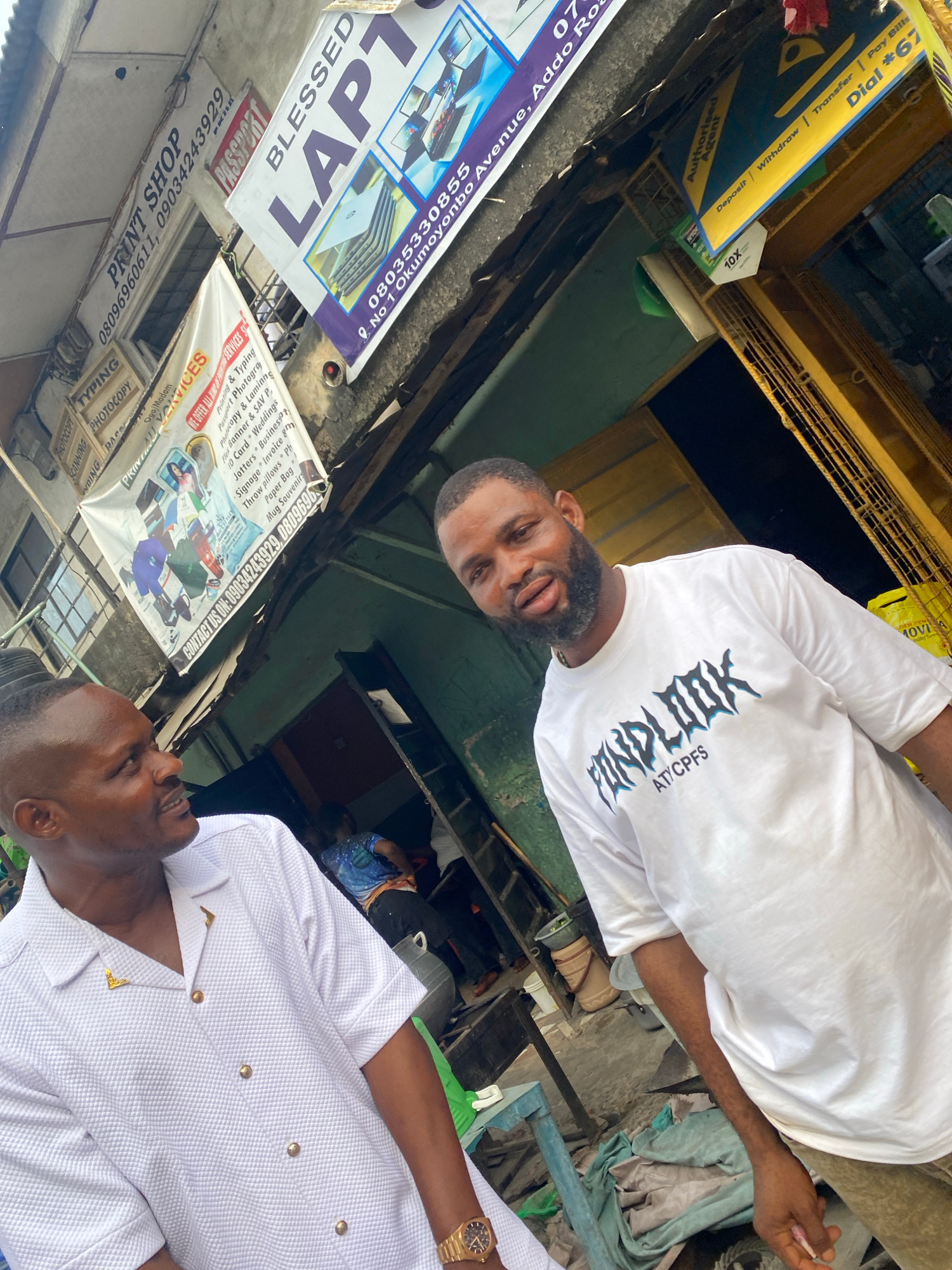 Two men stand together in Lagos, Nigeria, under a canopy of shop signs that advertise services such as printing, photocopying, passport photos, and typing. One man wears a white t-shirt with the word…read more