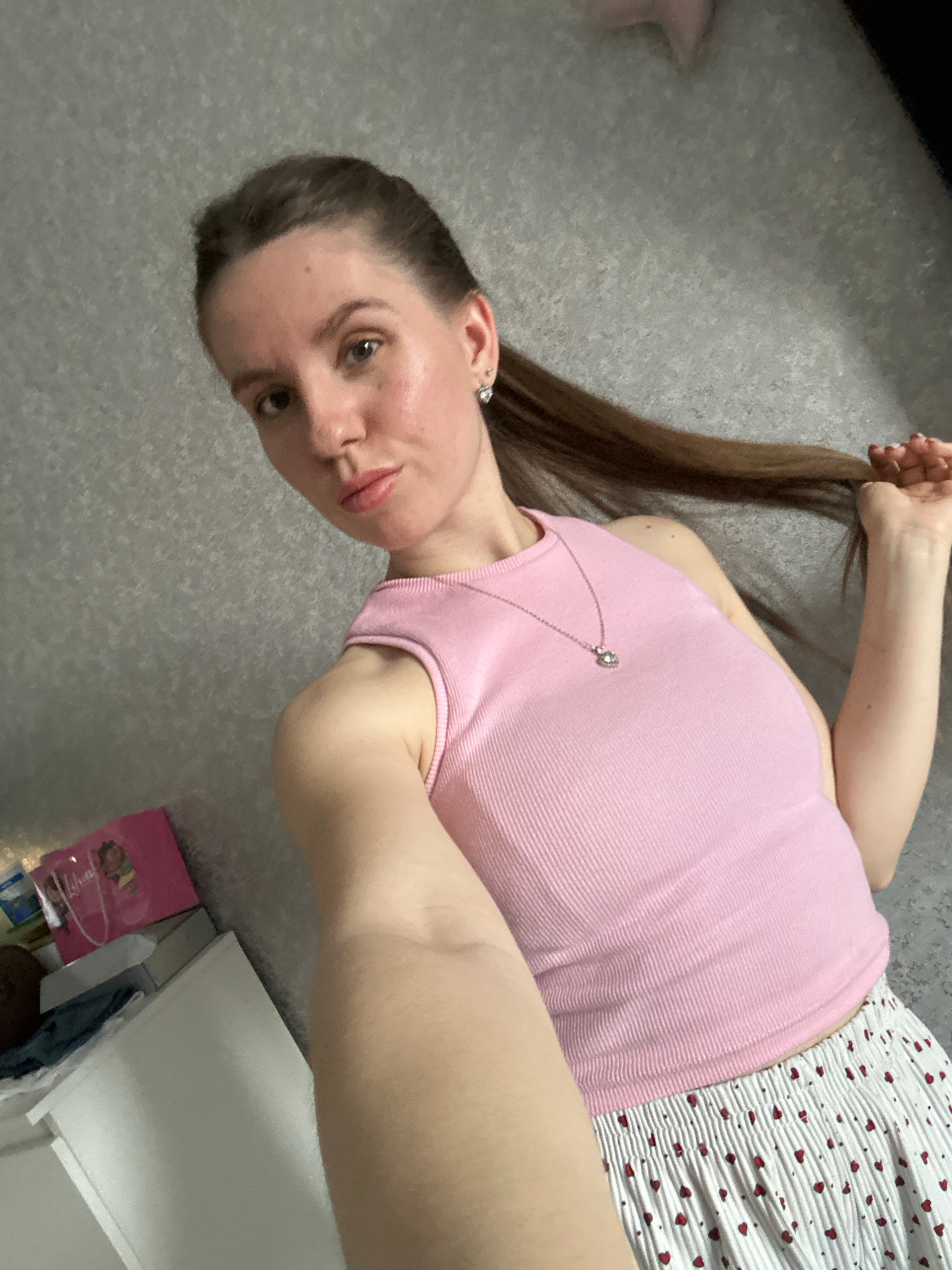 A young woman lies on a gray carpet in what appears to be an indoor setting. She wears a light pink ribbed tank top and white shorts with a small red heart print. Her long brown hair is pulled back inβ¦read more