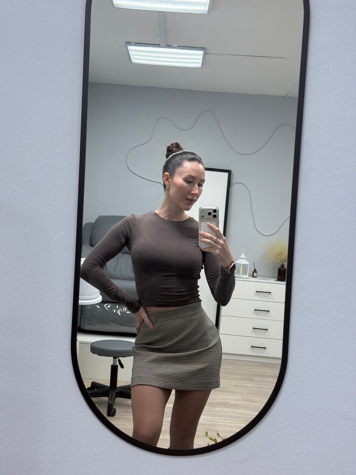 A woman in a brown long-sleeved shirt and checkered skirt takes a mirror selfie in what appears to be a residential setting. The mirror has a black frame and rounded corners. Reflected in the mirror i…read more
