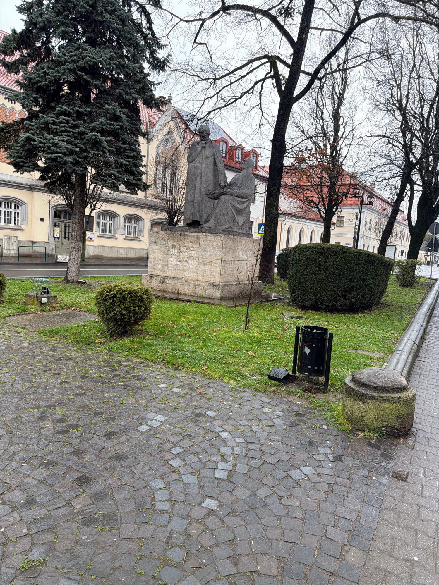 The image shows a cobblestone street in Târgu Mureș, Romania. A statue of a man in a long coat and glasses stands on a stone pedestal, with an inscription visible on the pedestal. Trees frame the stat…read more