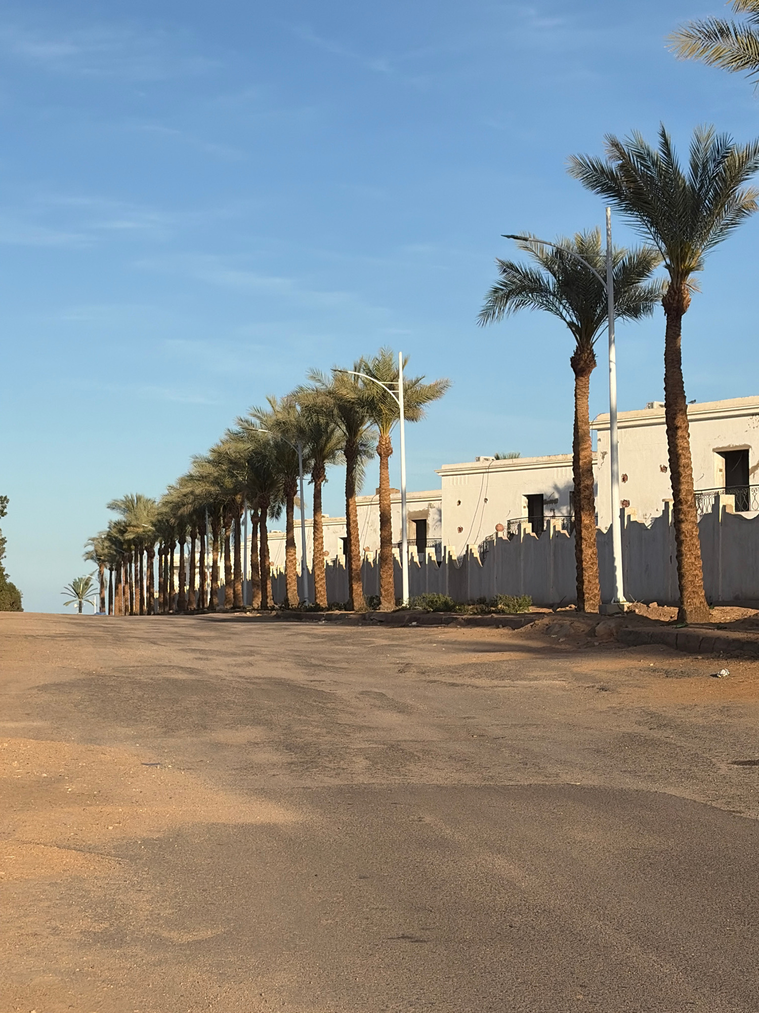 This image depicts a deserted asphalt road leading uphill, located in a residential or resort area of Sharm El Sheikh, Egypt. The road transitions to a dirt shoulder on its left side. A prominent row…read more
