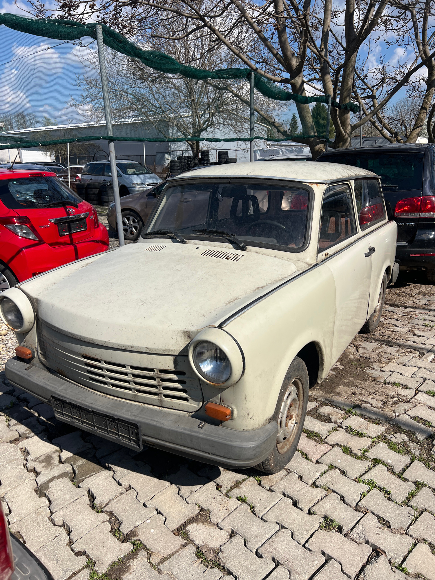 The image shows a slightly weathered, light-colored Trabant car parked on a gray interlocking paver surface. The car's front is facing the viewer. Its front left tire appears worn and slightly deflate…read more