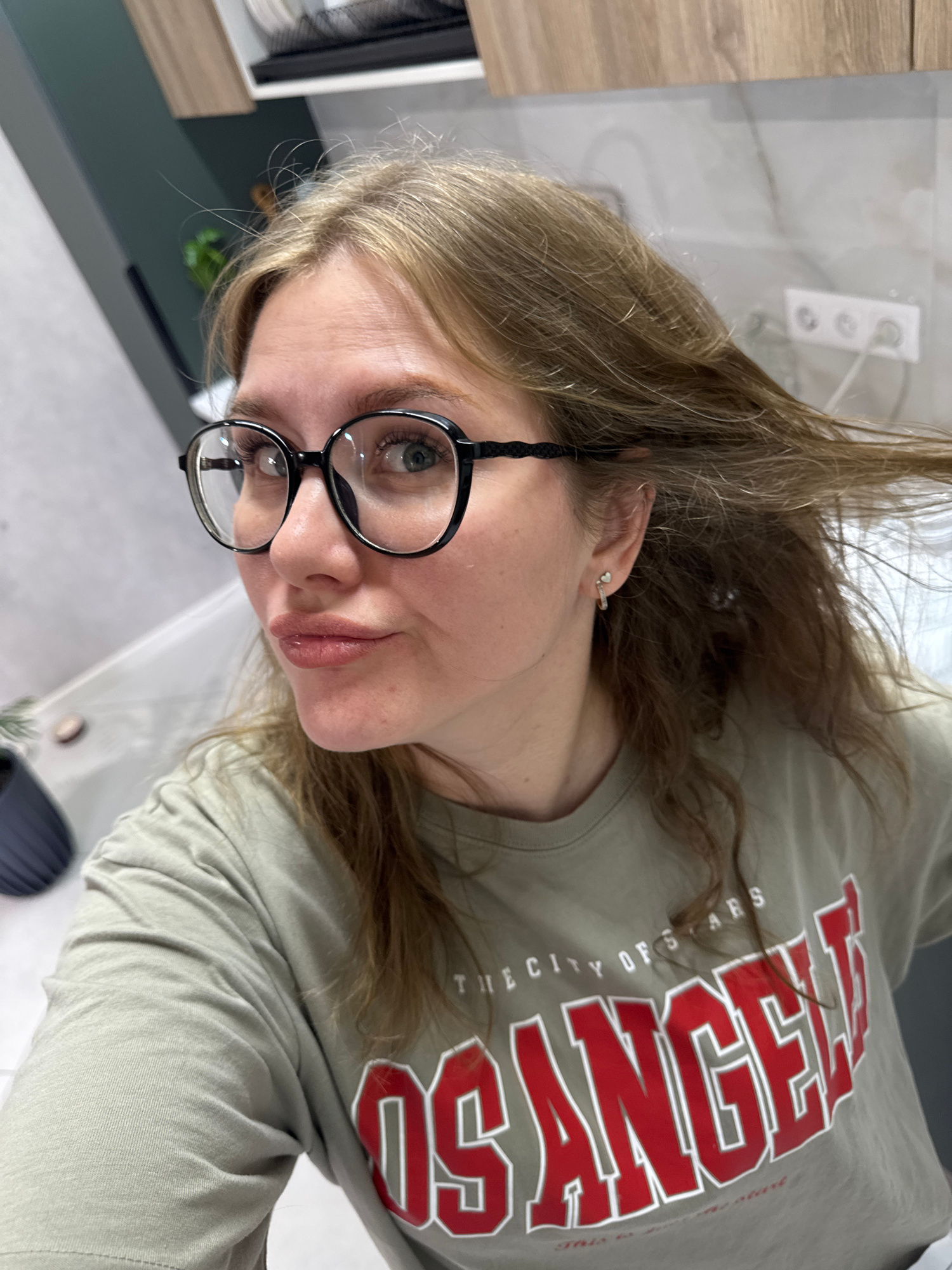 A woman with light brown hair and blue eyes, wearing black-framed glasses and a light olive green t-shirt with red and white lettering that reads "LOS ANGELES THE CITY OF STARS," is positioned indoors…read more