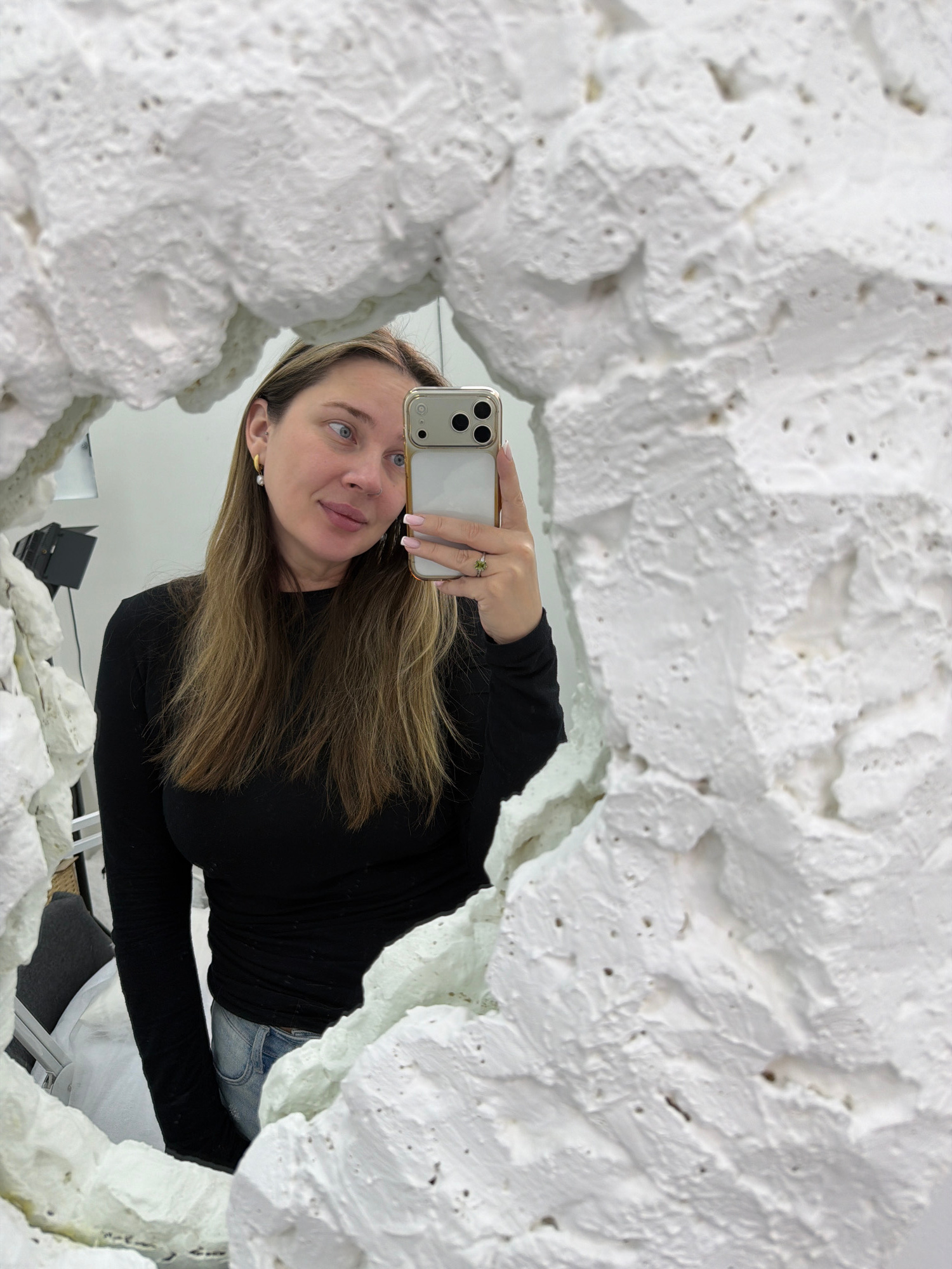A woman takes a selfie in a mirror surrounded by white textured material. She wears a black long-sleeved shirt and jeans, holding a gold iPhone with a white back. Her hair is light brown, and she has…read more