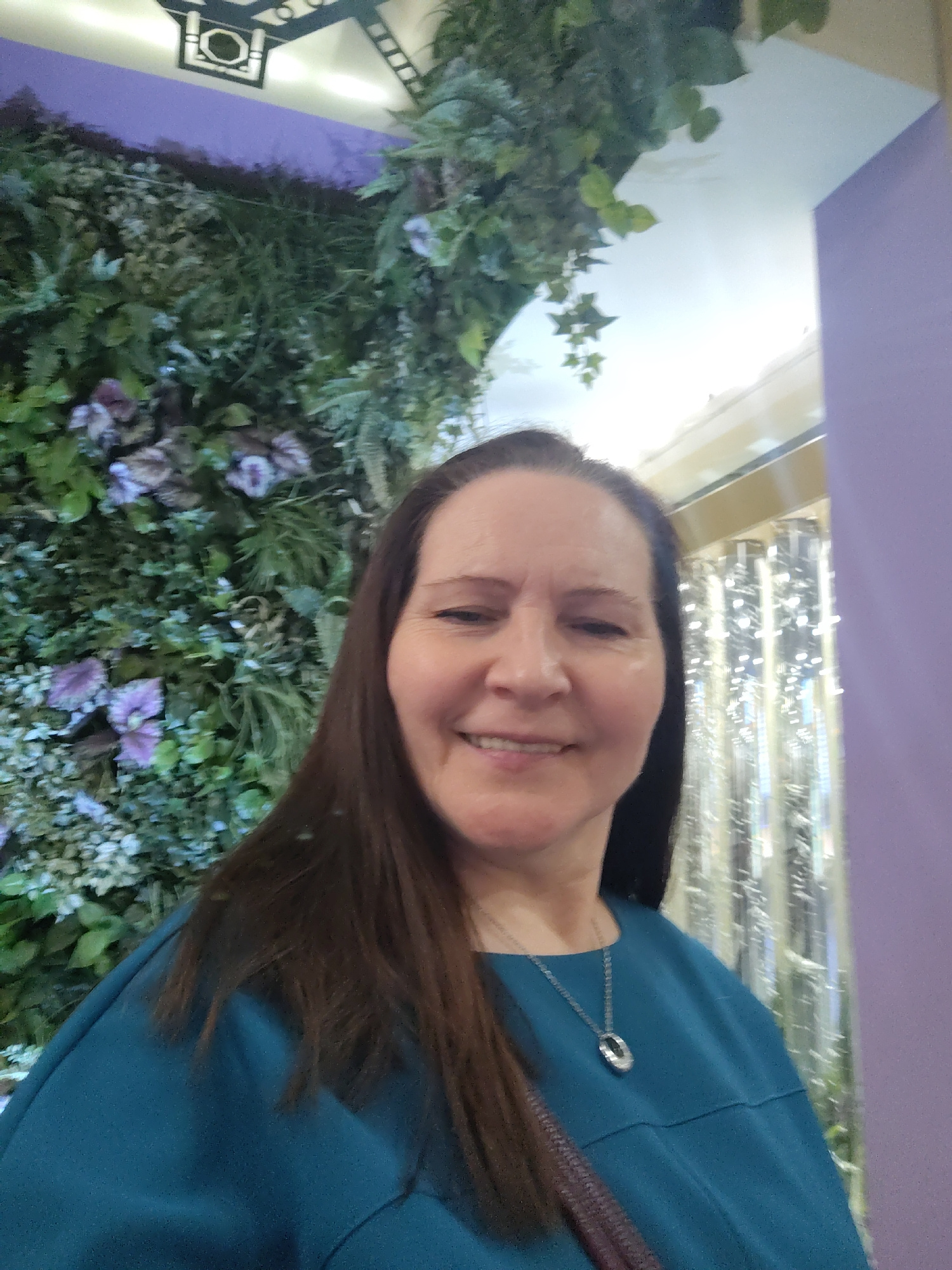 A smiling woman with long, dark brown hair is captured in a close-up, indoor, portrait-style photograph. She is looking directly at the camera, wearing a teal-colored top and a silver necklace with an…read more