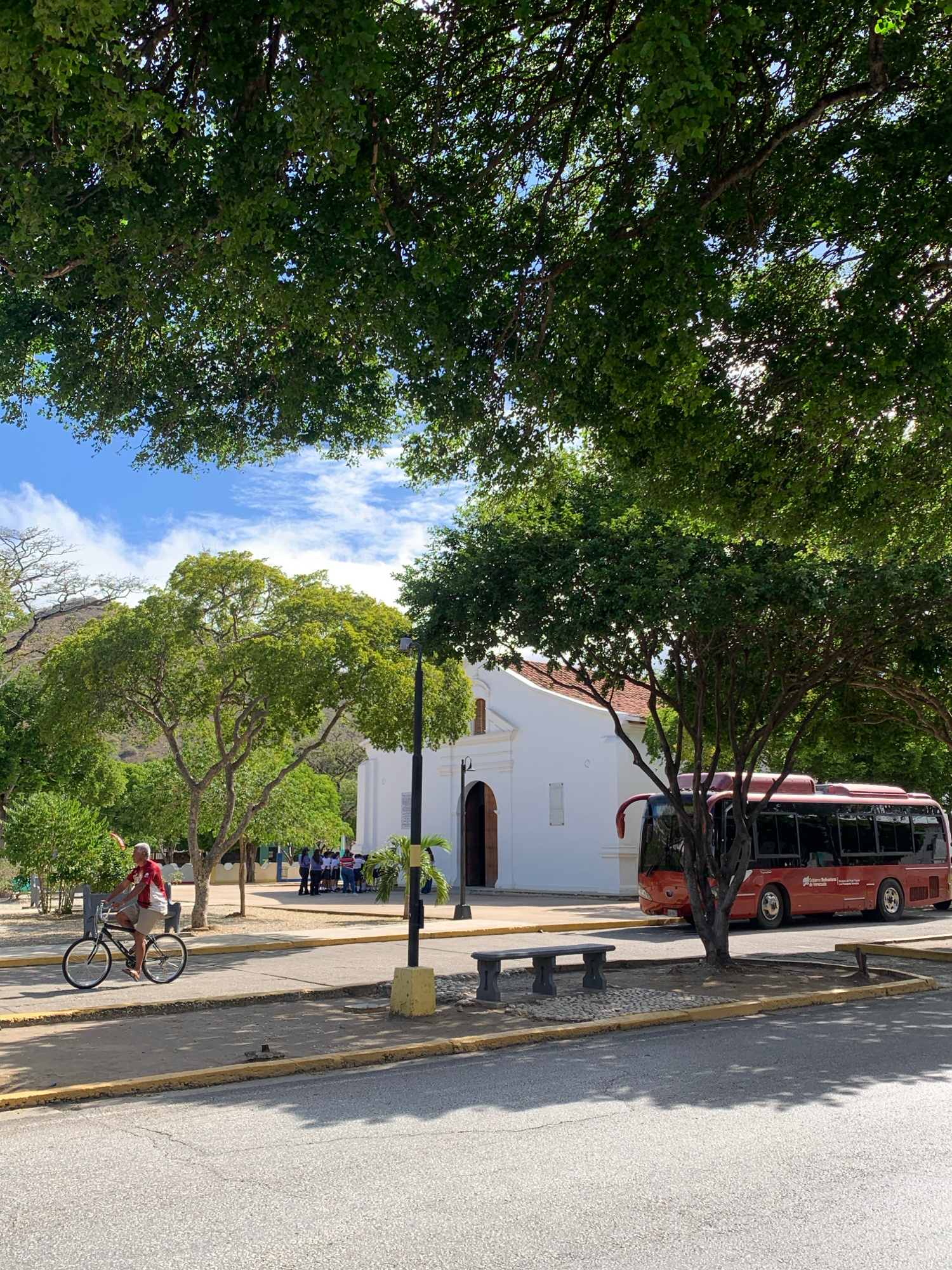 A street scene in Santa Ana, Venezuela, presents a cyclist near a paved road, flanked by a tree line on one side and a sidewalk with benches along the other. A red bus is parked next to a white buildi…read more