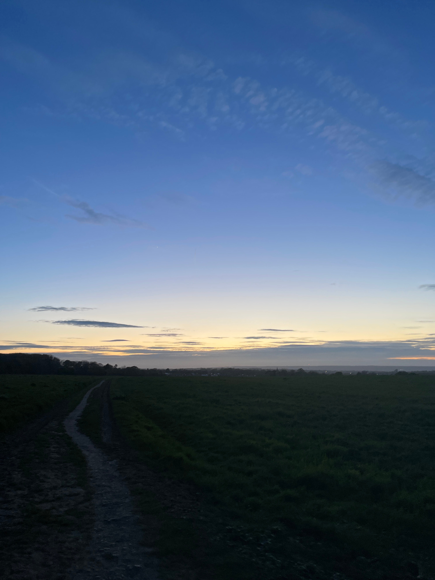 The image shows a landscape divided between a blue sky and a dark field. The sky is predominantly blue, with wispy clouds. A paler, yellow band separates the sky from the field, suggesting a horizon a…read more