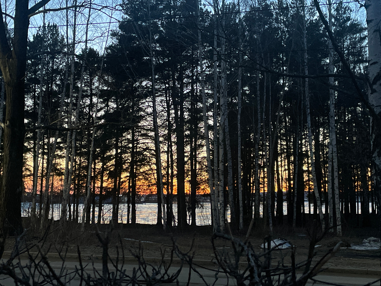 A landscape photograph taken in Chaikovsky, Russia, depicts a line of trees silhouetted against a body of water. The trees, consisting of both coniferous and birch varieties, are densely packed, creat…read more