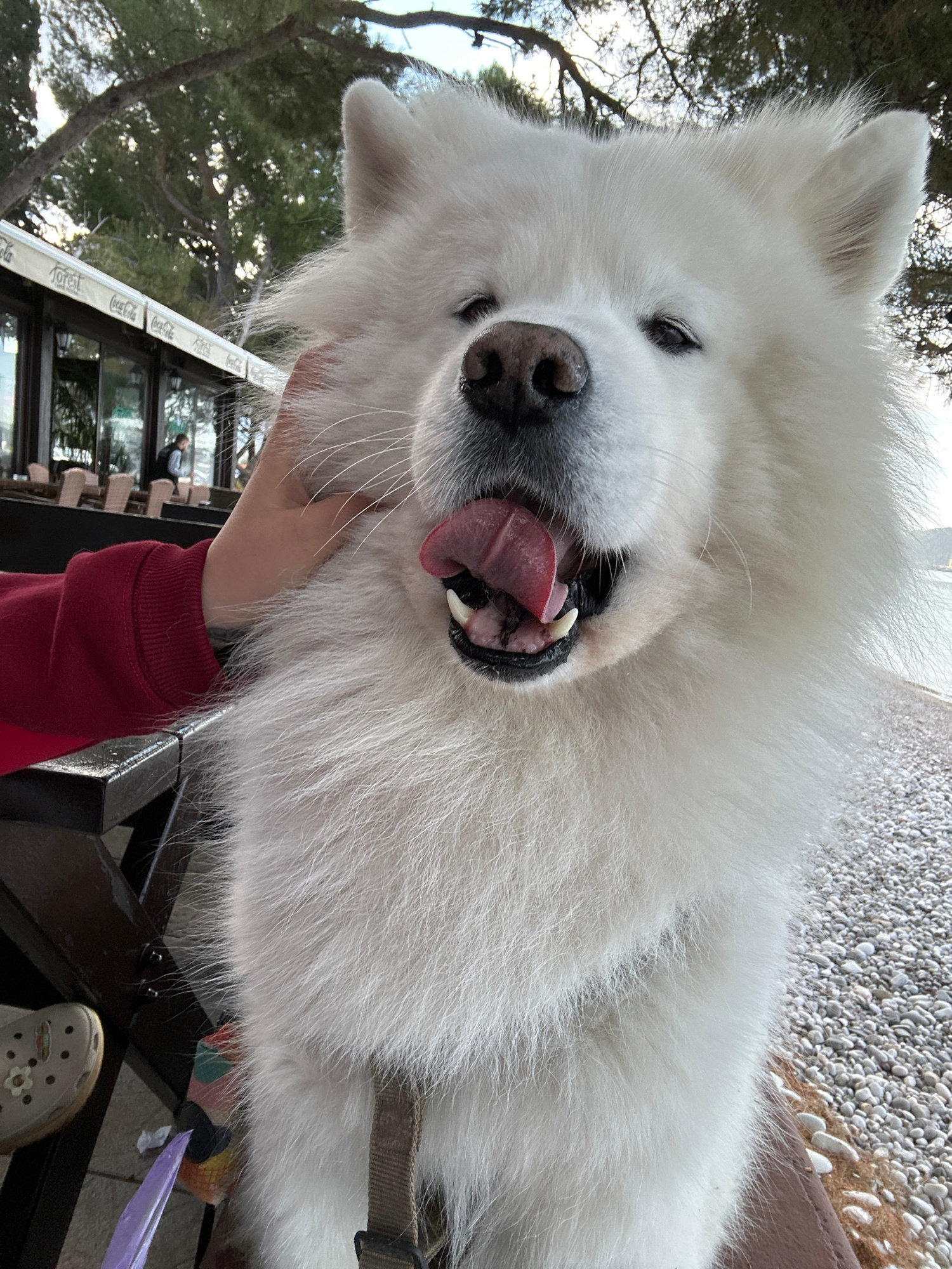 A close-up shot of a white Samoyed dog with its mouth open and tongue sticking out, being held by a person wearing a red sweater. The dog has a black nose and visible teeth. The person's hand is visib…read more