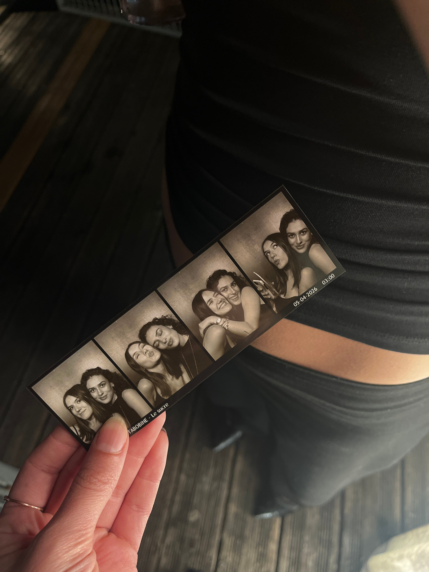 A person, wearing black, is holding a black and white photobooth strip. The strip contains five sets of images featuring two people each, presumed to be the same two people in each frame. The bottom i…read more