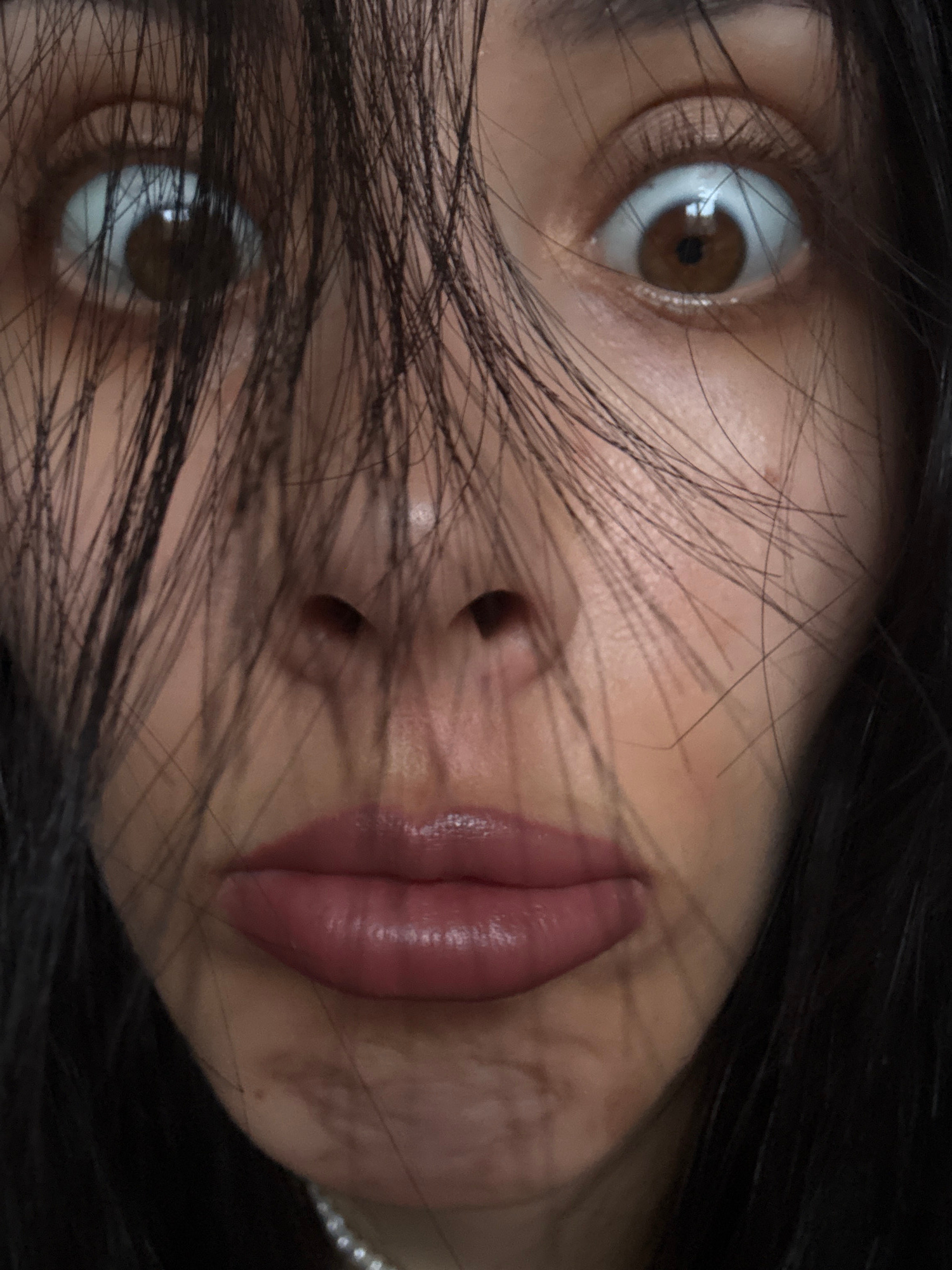 A close-up, rotated portrait shot captures the upper portion of a person's face. Dark, straight hair is spread across the face, partially obscuring the eyes and the bridge of the nose. The subject's t…read more
