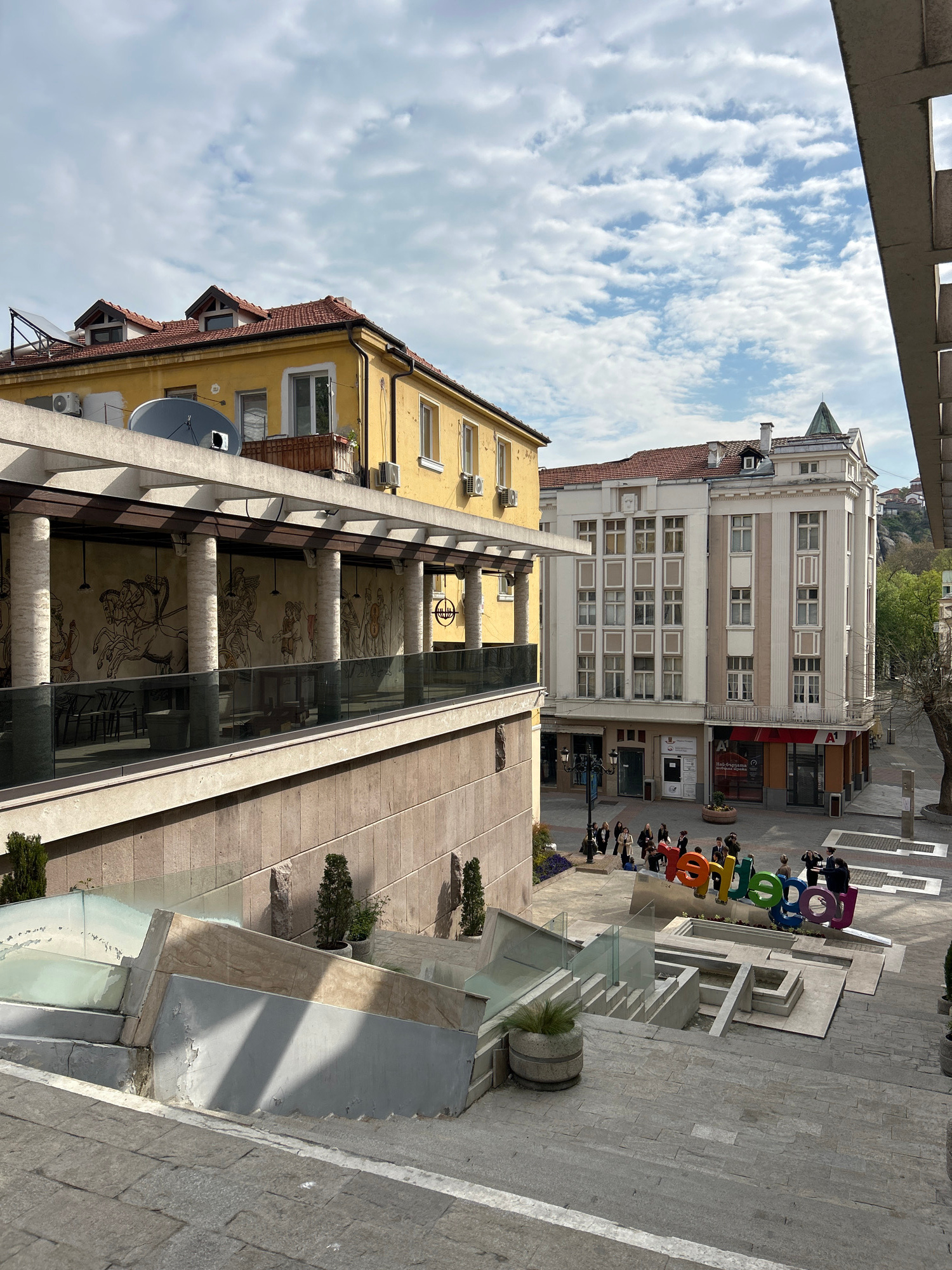The image shows a section of Plovdiv, Bulgaria, viewed from above. The scene includes a yellow building with a satellite dish and a light-colored building with multiple windows. Between these building…read more