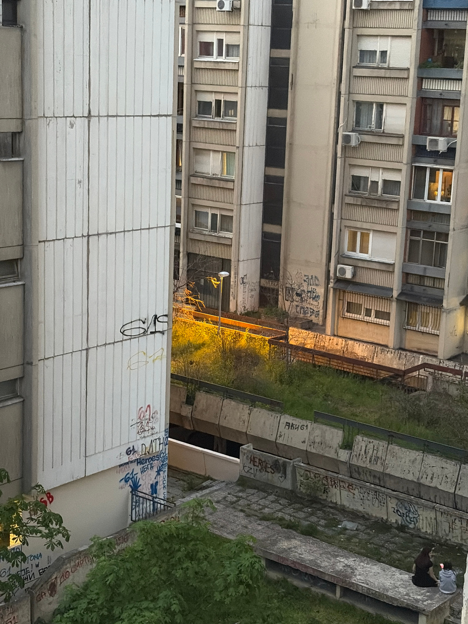 This image depicts a dense urban environment, likely a residential area in Belgrade, Serbia, characterized by multi-story concrete apartment buildings. The scene is viewed from an elevated perspective…read more