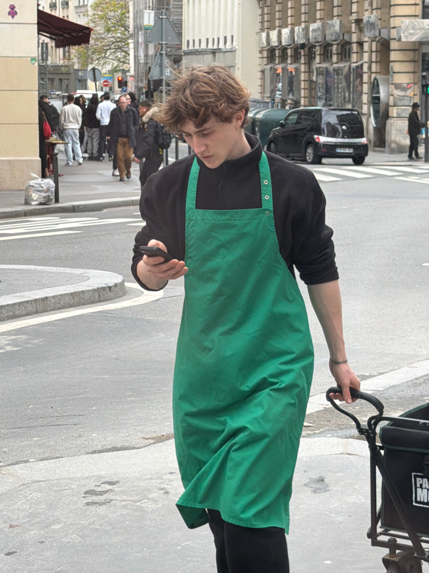 A young adult wearing a Starbucks apron is walking on a sidewalk in Paris, France. The individual is looking at a phone in their hand and holding the handle of a black cart. In the background, there a…read more
