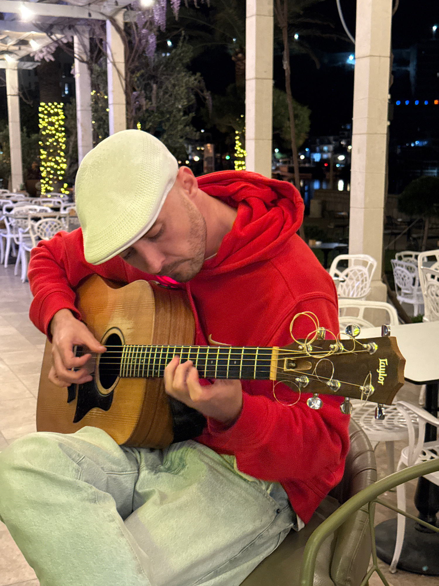 A man in a red hoodie and a white flat cap plays a Taylor acoustic guitar in an outdoor setting. The man sits with light blue jeans on, his head close to the guitar's neck, and his hands strum the str…read more