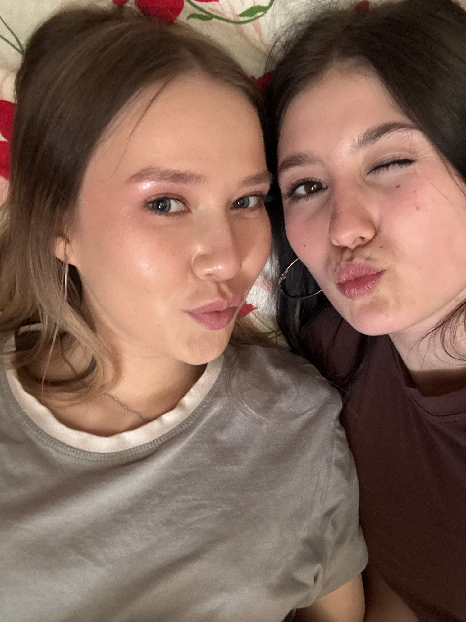 Two young women are lying down, posing for a selfie. The woman on top has dark hair and is winking, puckering her lips as if for a kiss. She wears a dark shirt and a silver hoop earring. The woman bel…read more