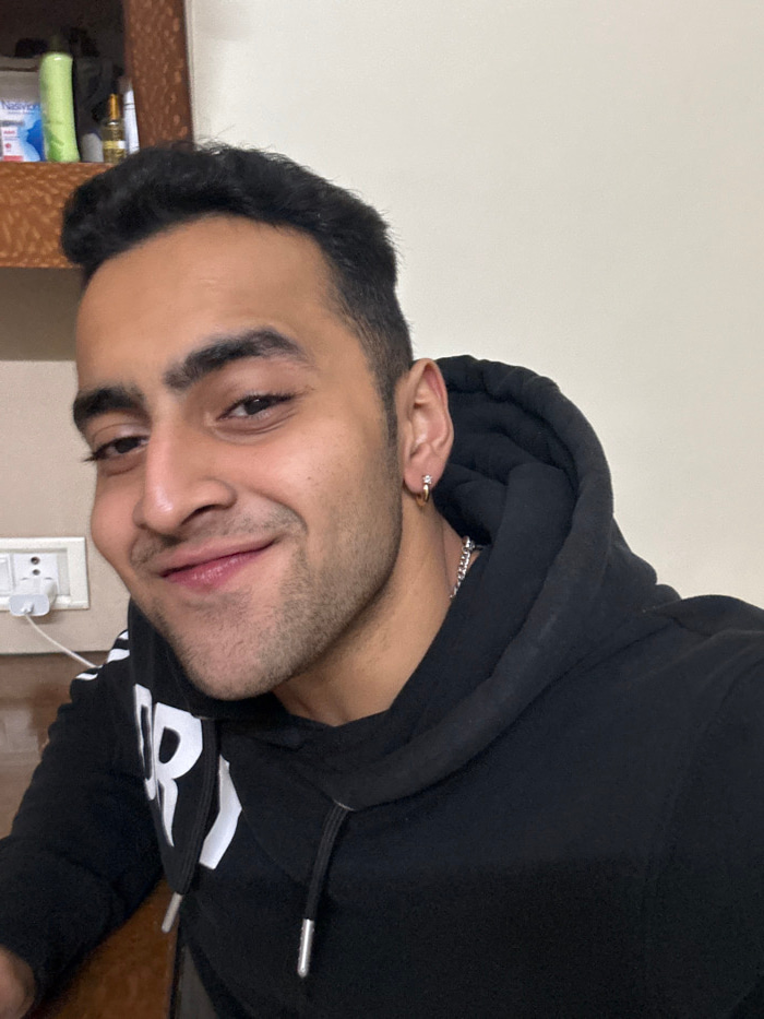 A young man with short dark hair and an earring poses in a black hoodie. He has fair skin, dark eyes, and light facial hair. A silver chain is visible at his neck. The background is a beige wall with…read more