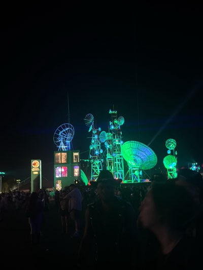 The image shows a nighttime scene, likely at a music festival in Indio, United States. In the foreground, there is a crowd of people, indistinct due to the darkness. In the background, there is a larg…read more