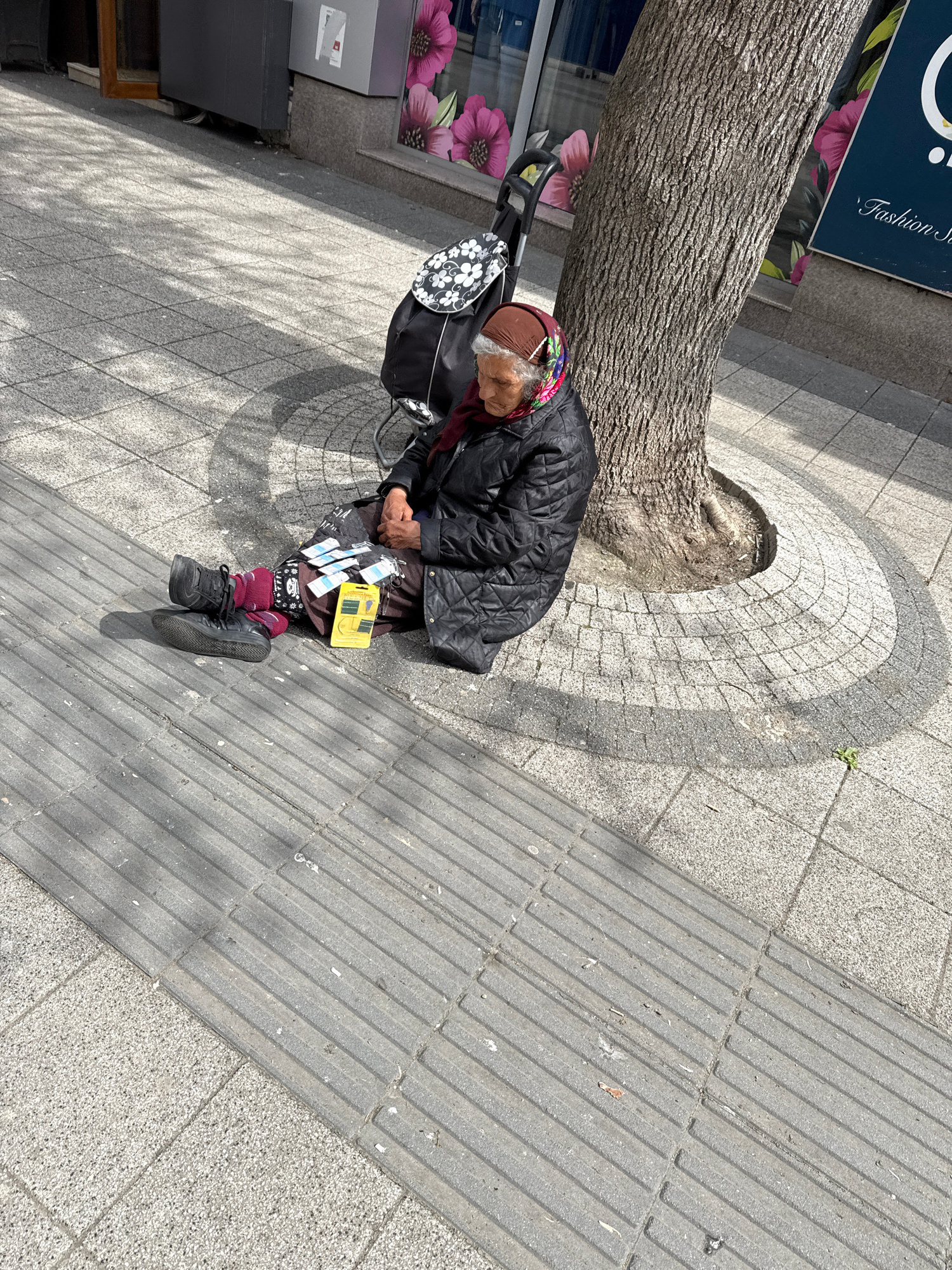 An elderly woman sits on a sidewalk beside a tree in Pleven, Bulgaria. She is wearing a dark quilted jacket, patterned headscarf, maroon leggings, and black sneakers. Beside her is a black tote bag wi…read more