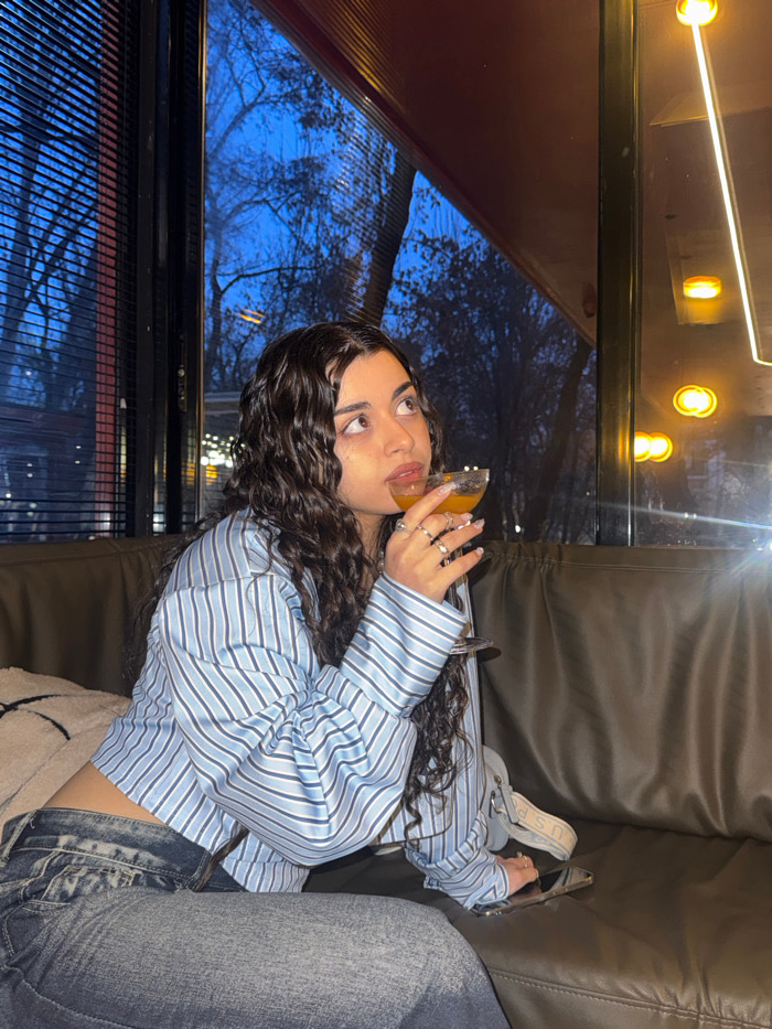 A young woman with dark, curly hair and light complexion is seated in a dark brown or olive green leather booth. She is wearing a light blue and white striped cropped long-sleeve shirt and blue jeans.…read more