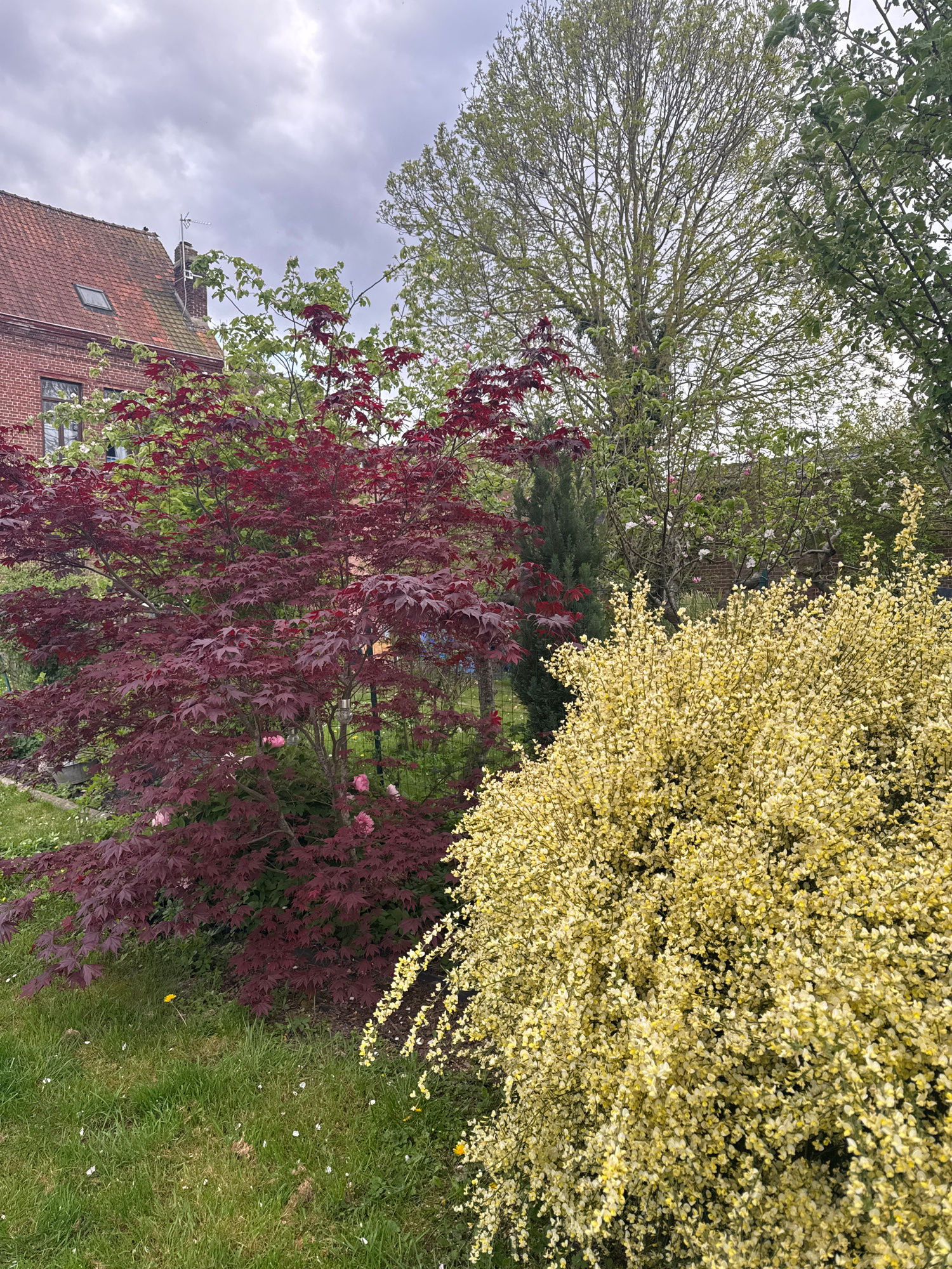 The image depicts a garden scene in Wattrelos, France. A red brick building with a pitched roof is visible on the left. The garden features a variety of trees and bushes, including a Japanese maple wi…read more