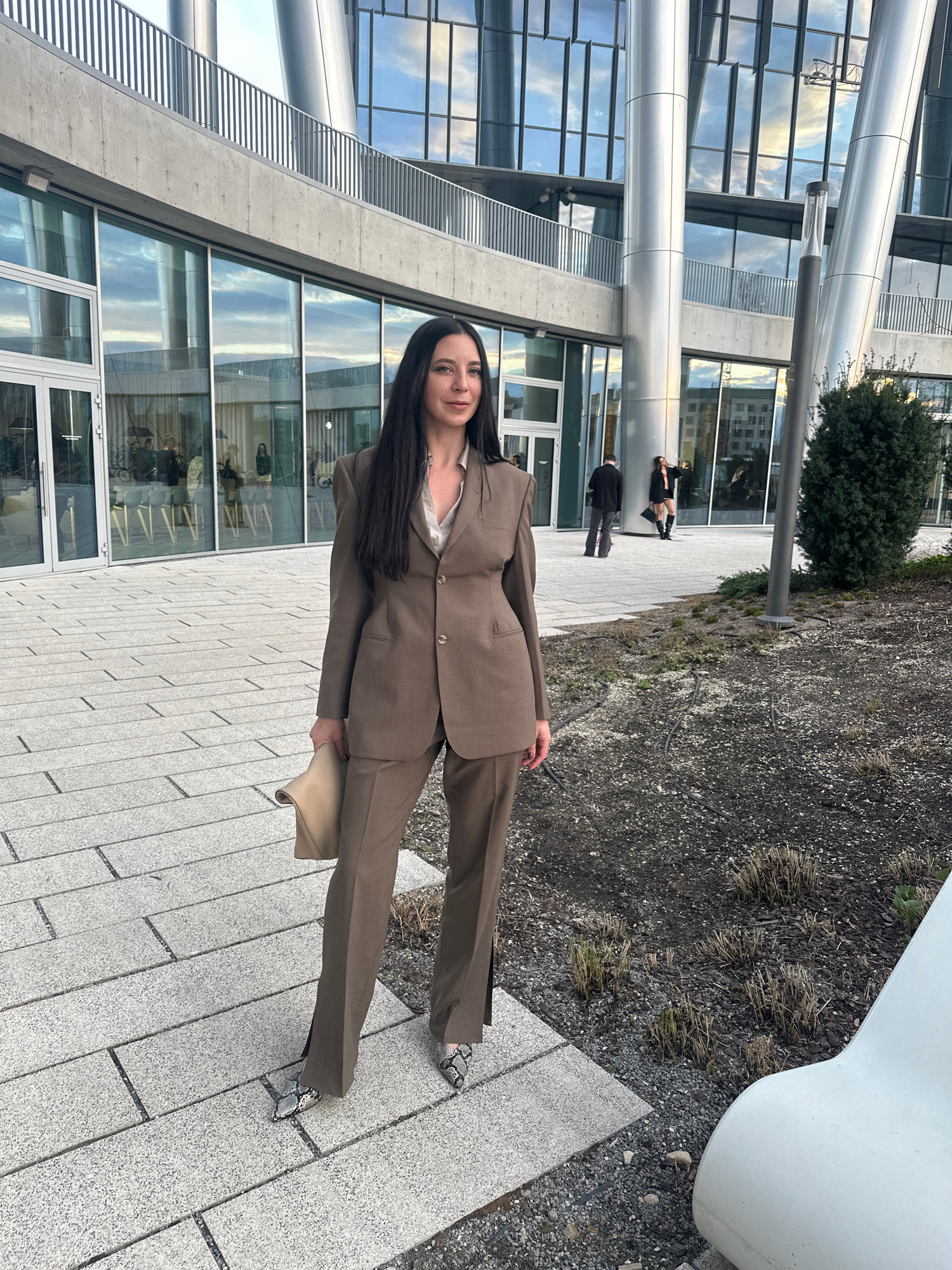 A woman is standing on a paved walkway. She has long, dark hair, is wearing a brown suit and holding a beige purse. She is facing the camera. Behind her is a modern building with glass windows and metβ¦read more