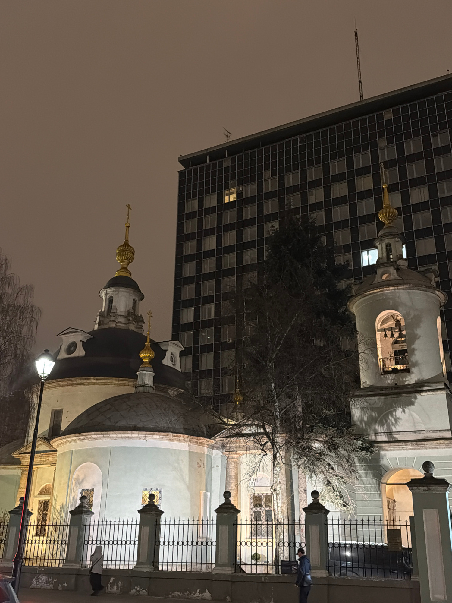 Here's a detailed description of the image: **Setting:** The image captures a nighttime scene in Moscow, Russia. The location appears to be a public space, possibly a street or plaza, given the prese…read more