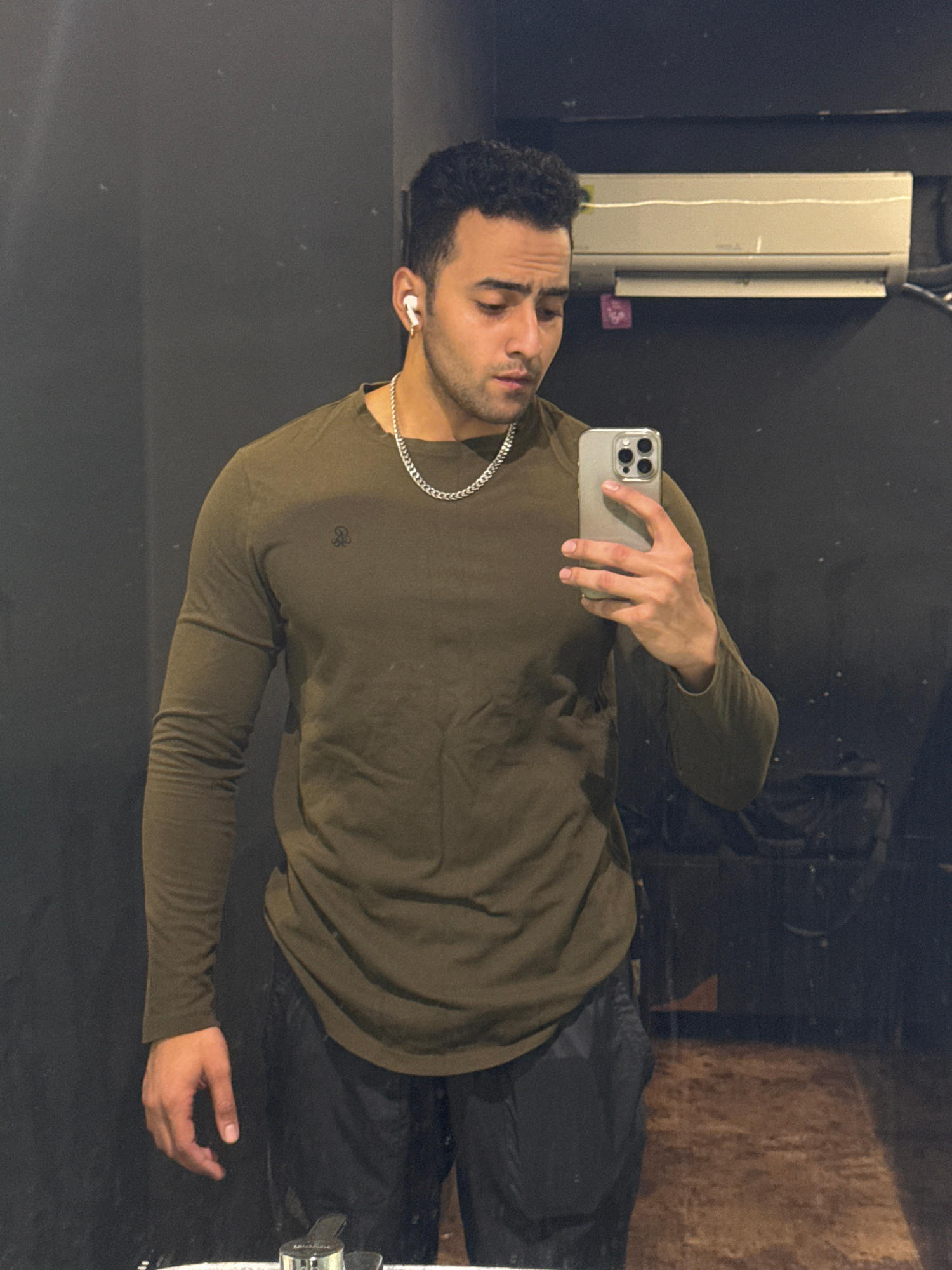 A male individual is captured in a mirror selfie within an indoor facility, likely a gym changing room or similar private space in Kolkata, India. The subject, a man with dark, short, curly hair and l…read more