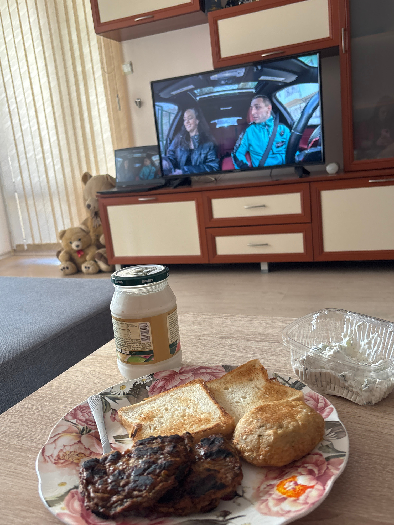 The image shows a living room or dining area. In the background, there's a large wooden cabinet unit and two televisions, one of which is playing a video of people inside a car. Blinds cover a window,…read more