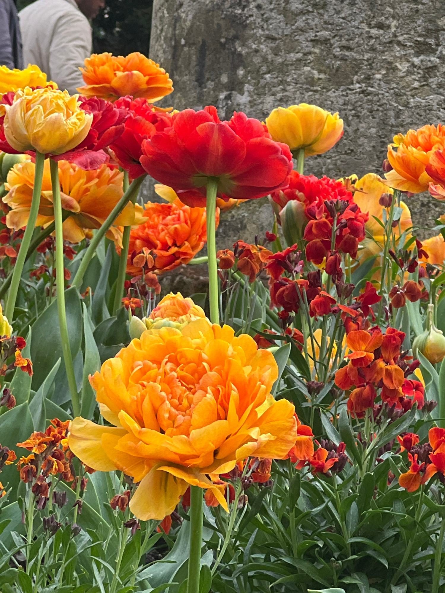 The image shows a vibrant display of red, orange, and yellow flowers, with lush green foliage. A stone structure is visible on the left. Based on the flower variety and style, this is likely a formal…read more
